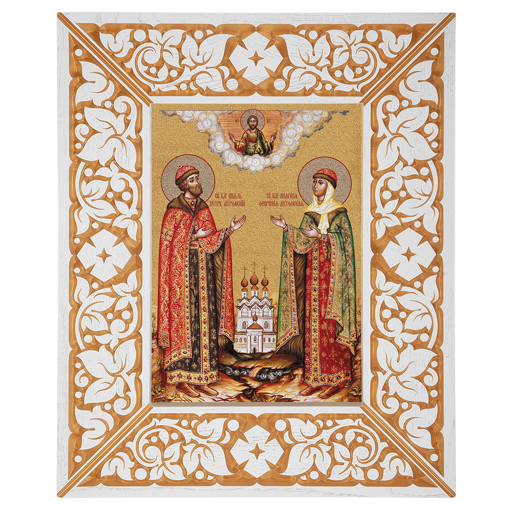 Икона благоверных князей Петра и Февронии Муромских, в широкой резной раме, белая с золотом (патина), холст с золочением, ширина рамы 12 см