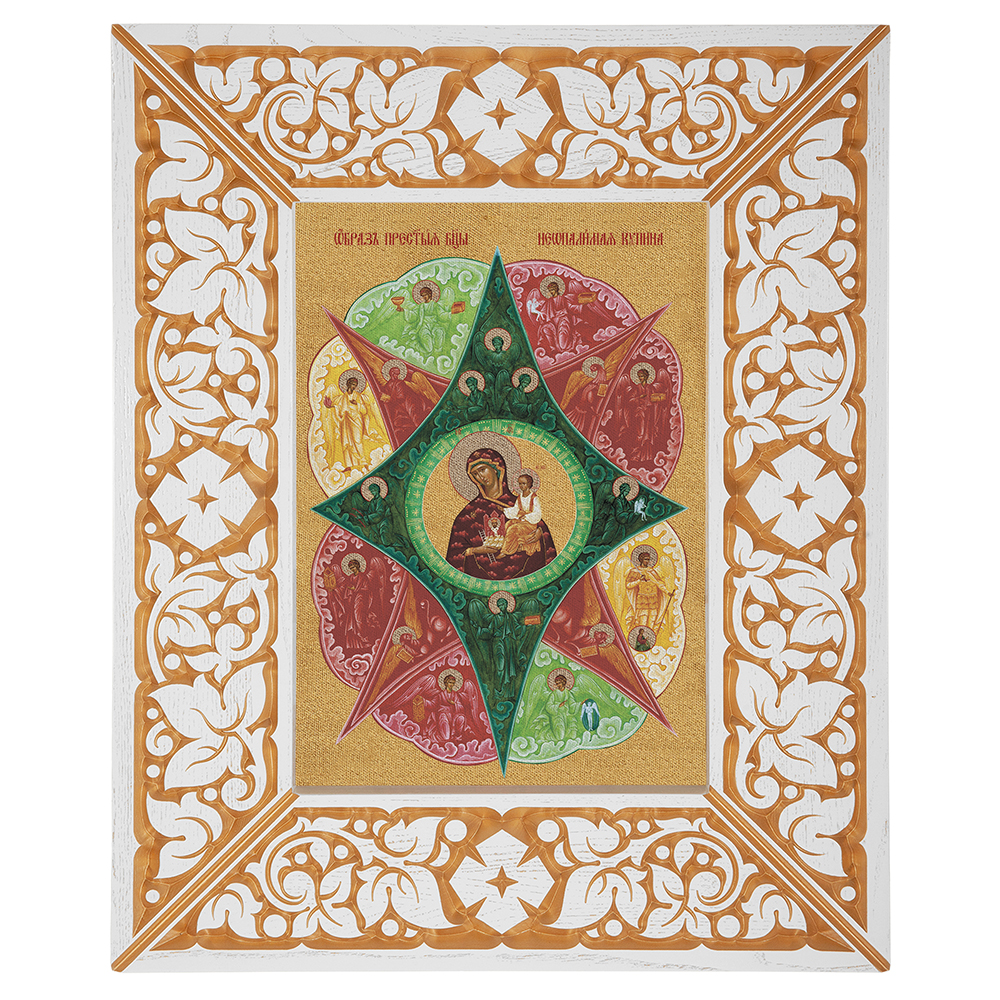 Икона Божией Матери "Неопалимая Купина", в широкой резной раме, белая с золотом (патина), холст с золочением, ширина рамы 12 см