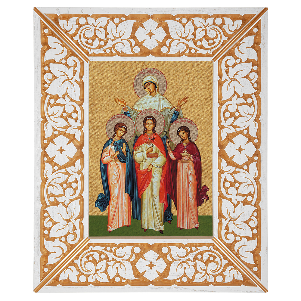 Икона мучениц Веры, Надежды, Любови и матери их Софии, в широкой резной раме, белая с золотом (патина), холст с золочением, ширина рамы 12 см