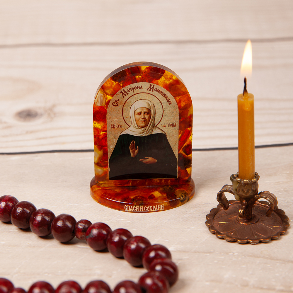 Настольная икона блаженной Матроны Московской в рамке-основе из смолы с янтарем.