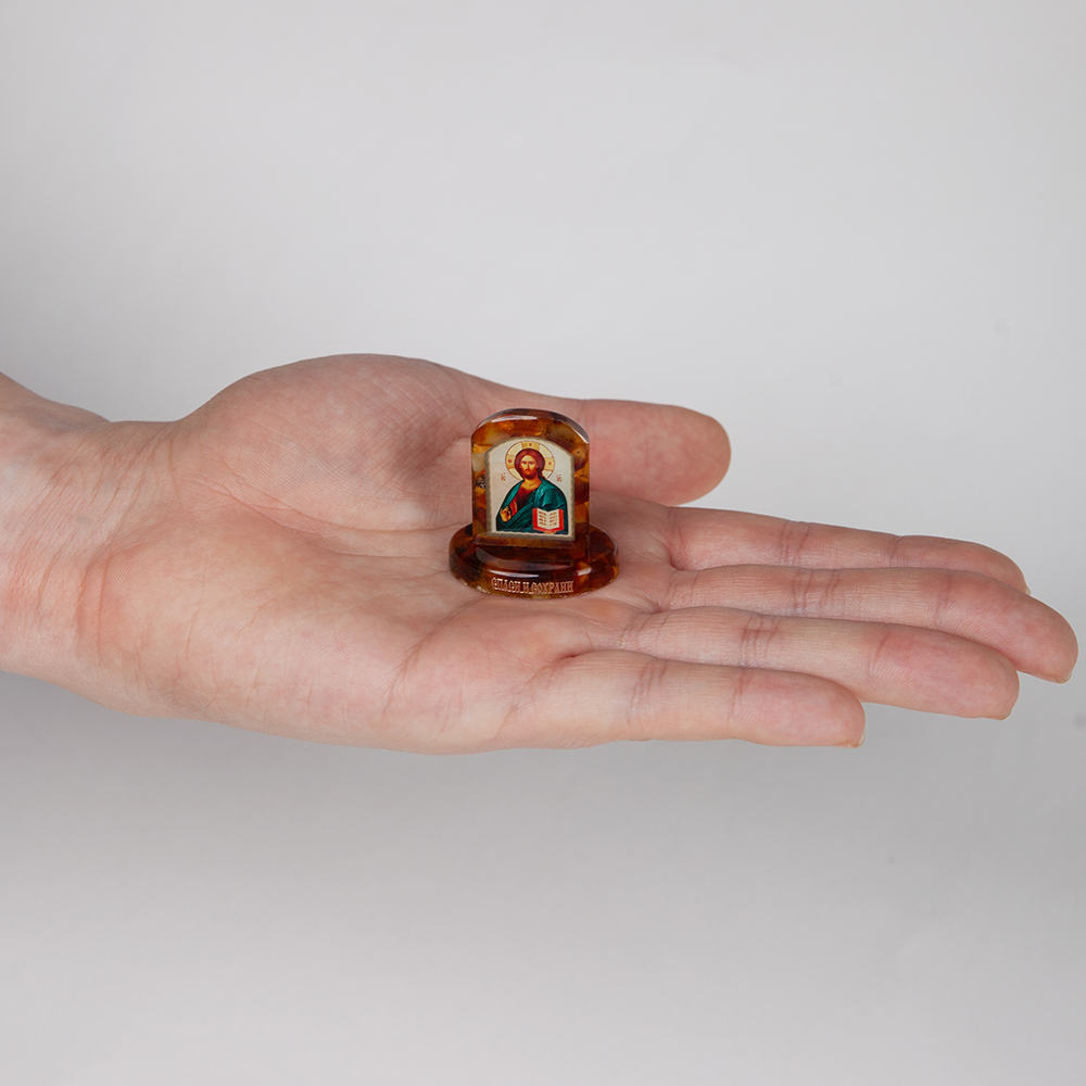 Небольшая настольная икона в оригинальном оформлении украсит рабочий стол или домашний иконостас. Цветное изображение выполнено методом фотопечати и защищено от неблагоприятного внешнего воздействия слоем ювелирной смолы. В качестве рамки с устойчивым основанием используется форма из смеси смолы с янтарем, полупрозрачная структура которой необычно смотрится на солнце и дает приятный отблеск теплого желтого цвета. По краю основы выполнена надпись "Спаси и сохрани". Такая настольная икона станет отличным подарком ко дню тезоименитства или по случаю церковного праздника.