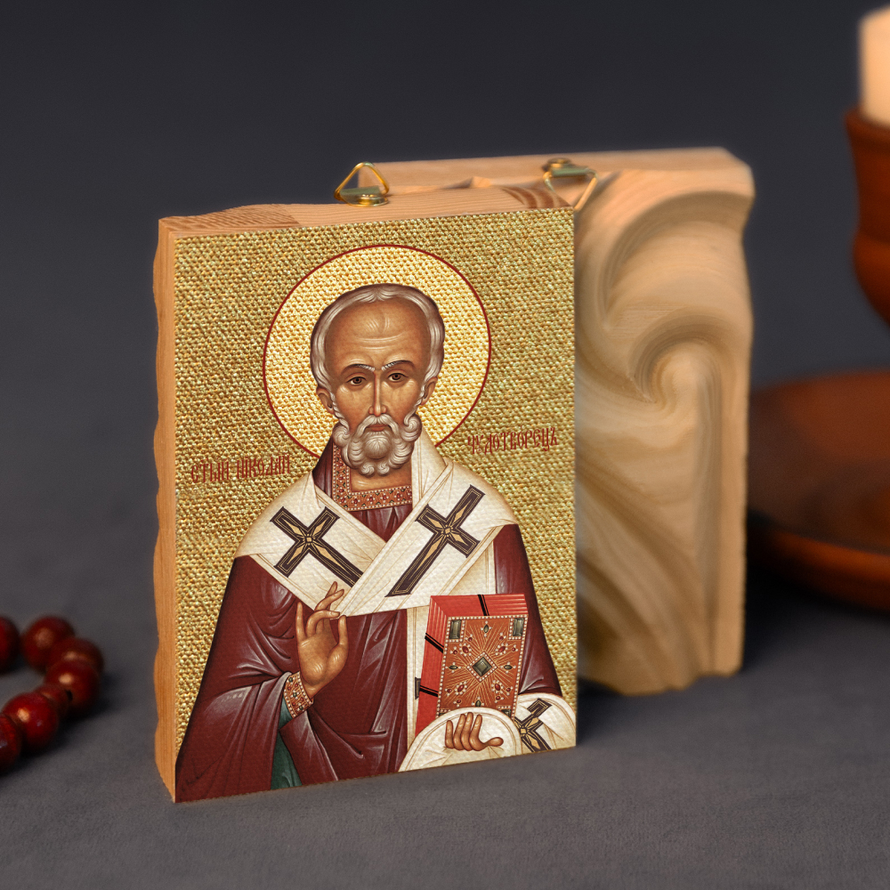 Икона святителя Николая Чудотворца на деревянной основе, на холсте с золочением фото 3