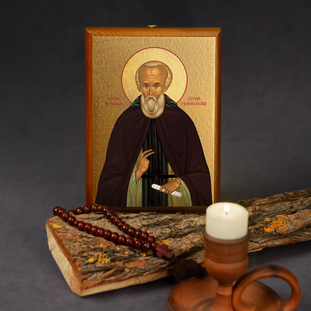 Икона преподобного Сергия Радонежского на деревянной основе, цвет "кипарис", на холсте с золочением