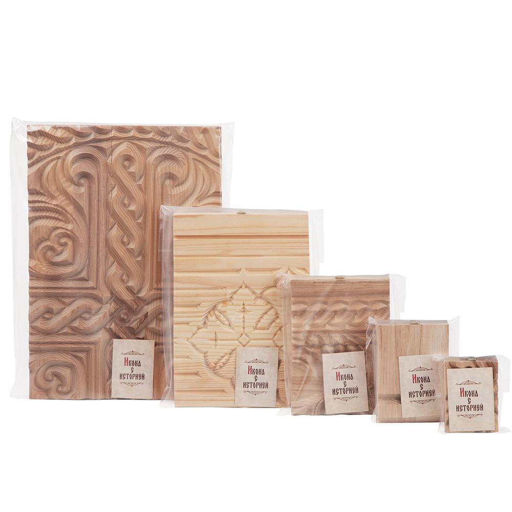 Данная икона имеет интересную особенность. Ее доска сделана из фрагмента натуральной древесины, оставшегося при изготовлении убранства православного храма. Поэтому ее оборотную часть украшают элементы резьбы. Изготавливая такие иконы, фабрика церковной утвари ОРТОКС заботится о природе: мы используем каждый кусочек дерева. А еще – предлагаем людям неповторимые изделия, у которых есть «родственники» в православных храмах. Возможно, однажды вы зайдете в одну из церквей и увидите в ней иконостас, при рождении которого появилась на свет эта икона!