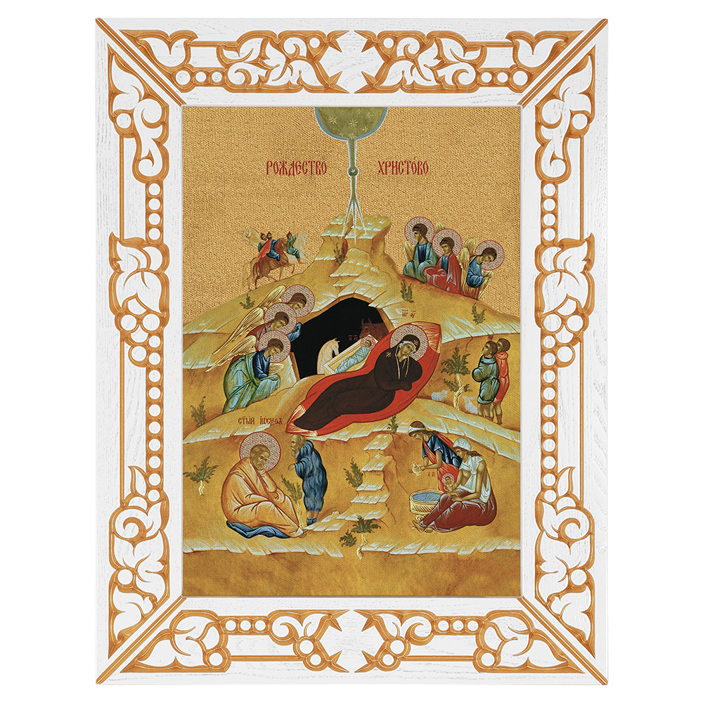 Икона Рождества Христова, в узкой резной раме, белая с золотом (патина), холст с золочением, ширина рамы 7 см