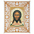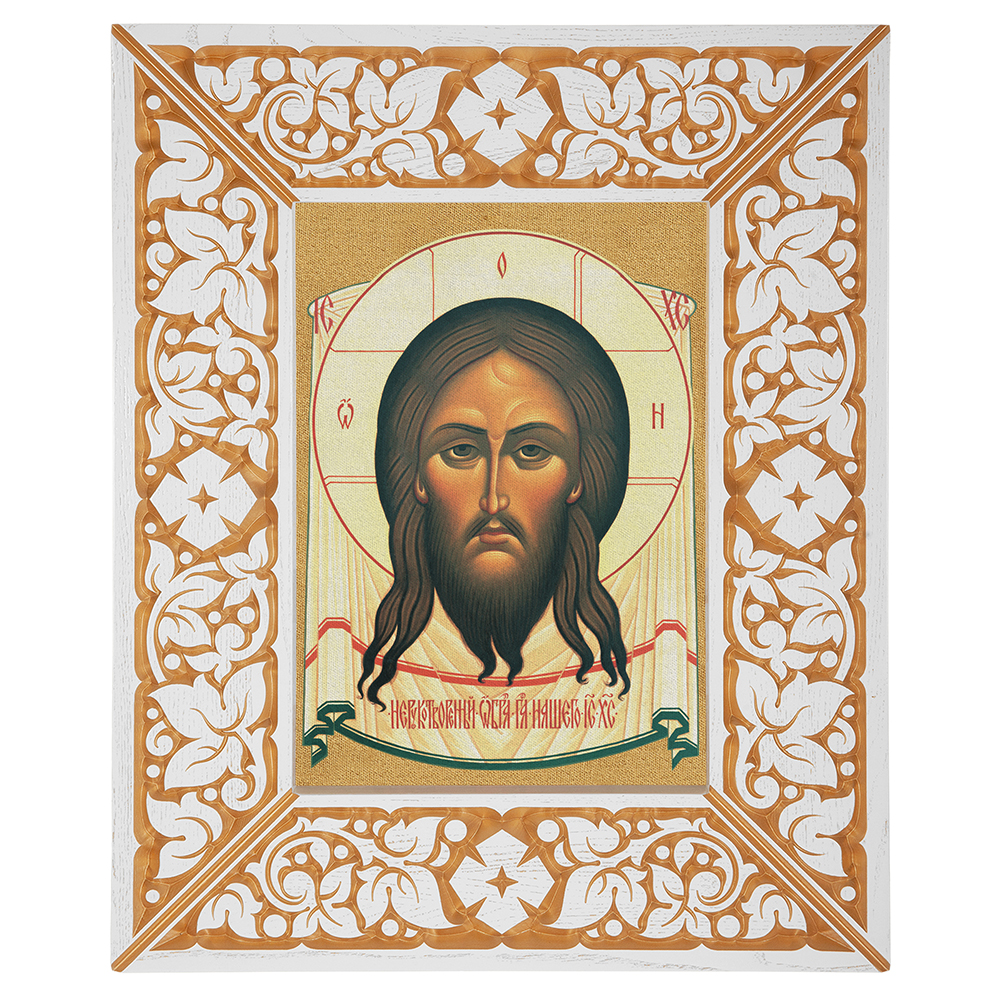 Икона Спасителя "Нерукотворный образ", в широкой резной раме, белая с золотом (патина), холст с золочением, ширина рамы 12 см