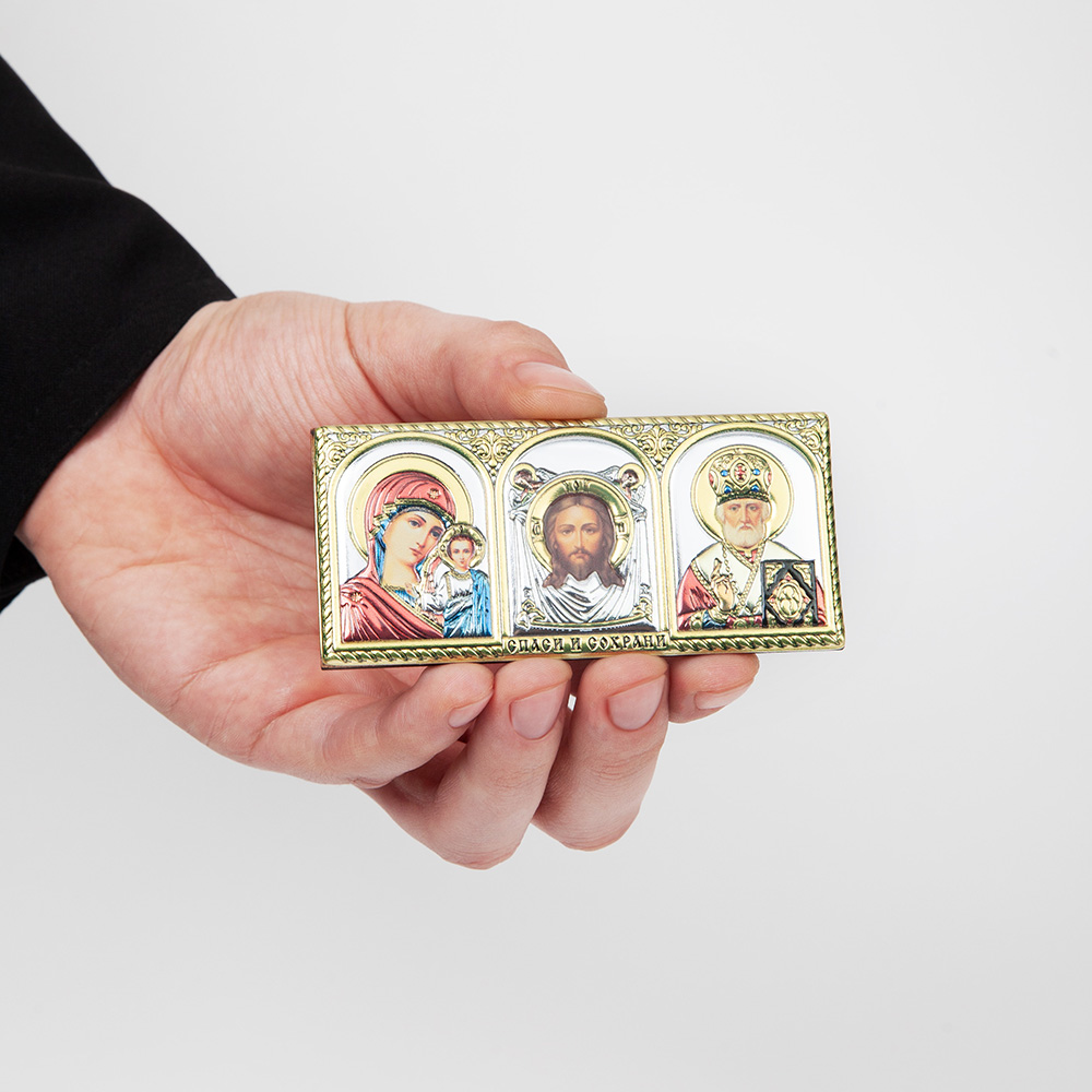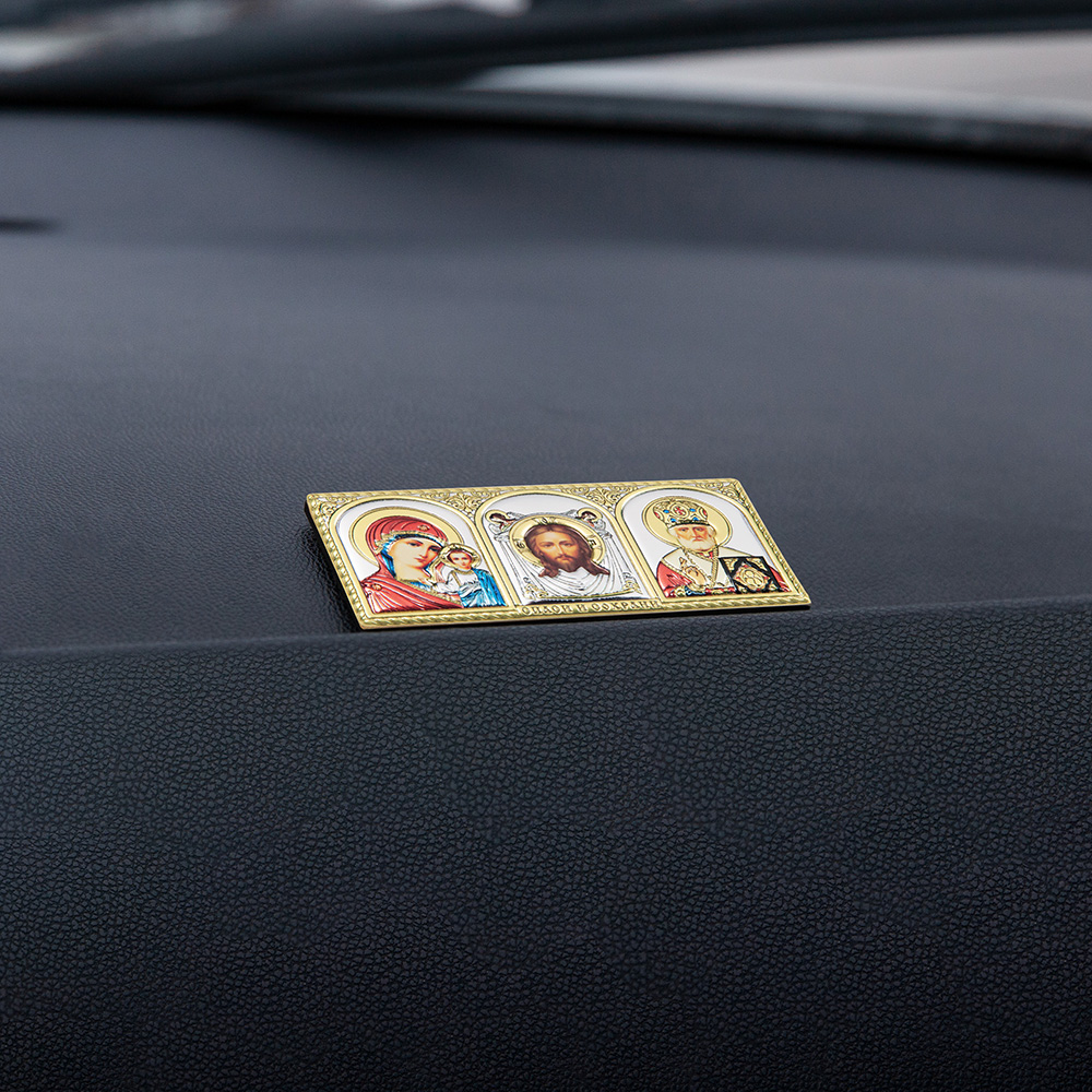 Икона в машину изготовлена в виде триптиха с ликами Спасителя, Божией Матери и особо чтимых святых. Её размещают на лобовом стекле или на приборной панели на удобной высоте, где изделие не будут мешать обзору.