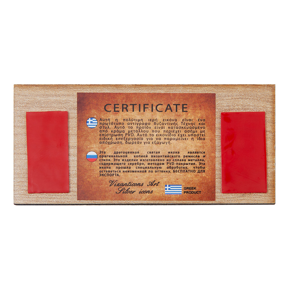 Для изготовления иконы использован металлический сплав с PVD-покрытием, нанесенным по технологии конденсации тонкого слоя материала в условиях вакуума. Благодаря твердости и особому химическому составу такого покрытия изображение защищено от коррозии и потемнения.