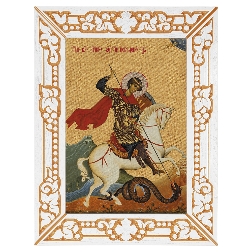 Икoна великомученика Георгия Победоносца, в узкой резной раме, белая с золотом (патина), холст с золочением, ширина рамы 7 см