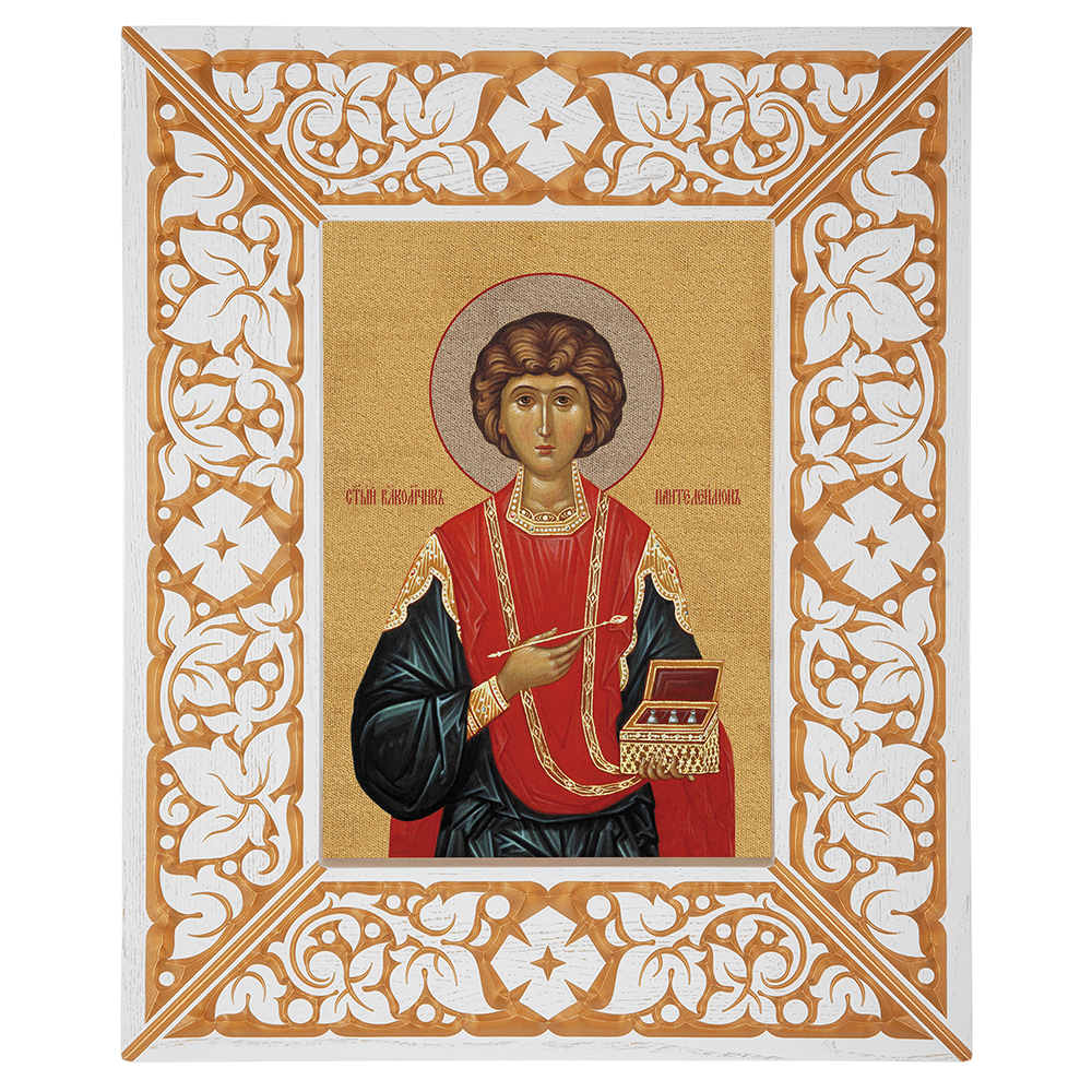 Икона великомученика и целителя Пантелеимона, в широкой резной раме, белая с золотом (патина), холст с золочением, ширина рамы 12 см