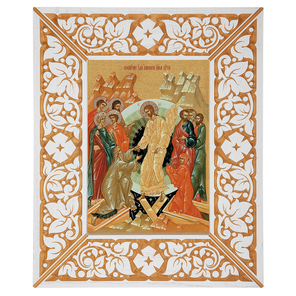 Икона Воскресения Христова, в широкой резной раме, белая с золотом (патина), холст с золочением, ширина рамы 12 см