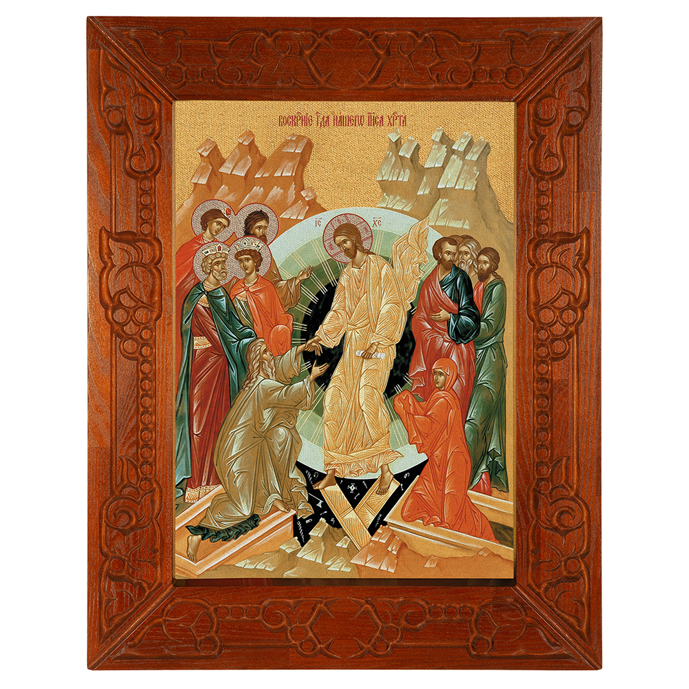 Икона Воскресения Христова, в узкой резной раме, цвет "кипарис", холст с золочением, ширина рамы 7 см