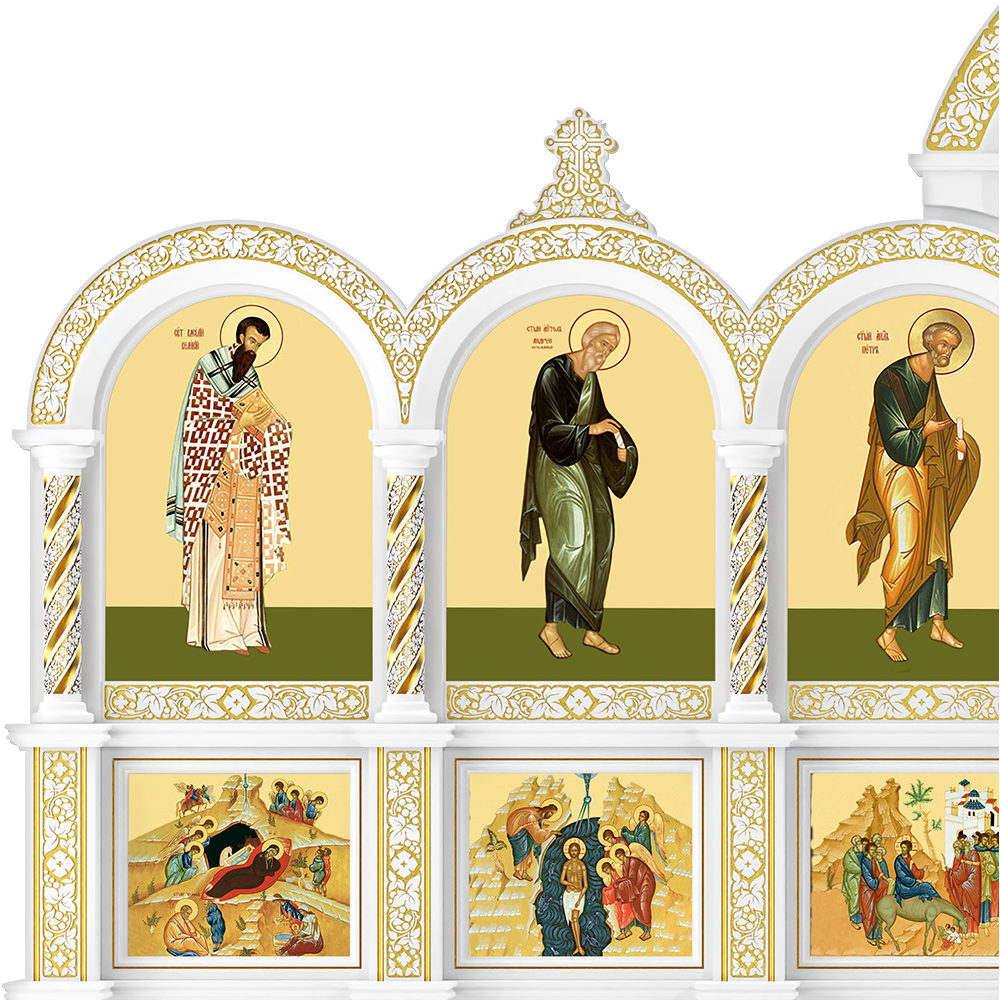 Иконостас деревянный резной "Владимирский" трехъярусный белый с золотом (патина), 690х620х40 см