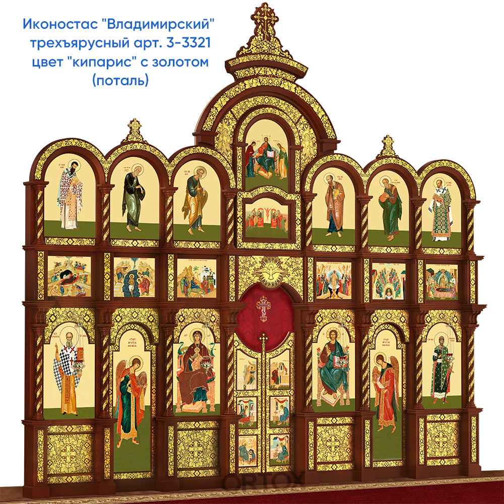 Иконостас деревянный резной "Владимирский" трехъярусный, цвет "кипарис", 690х620х40 см