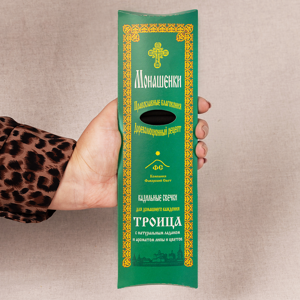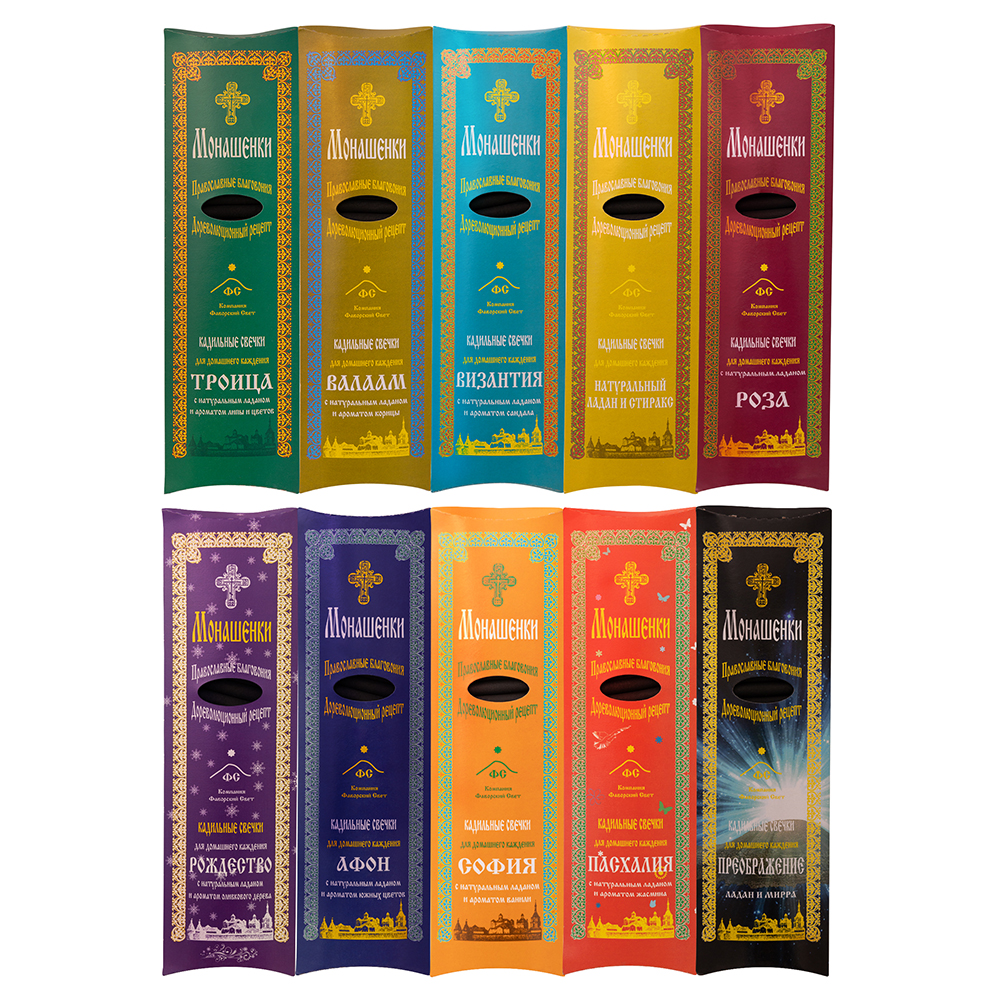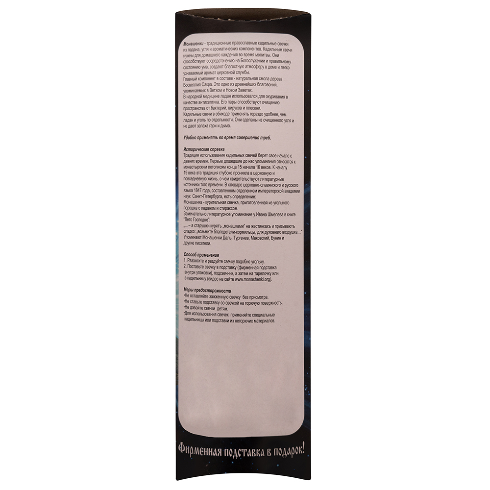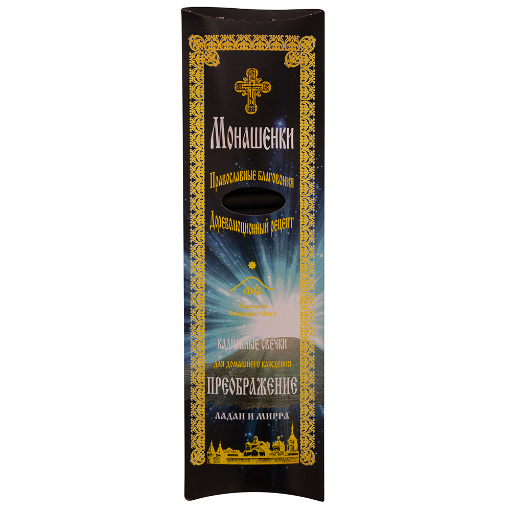 Традиционные православные кадильные свечки из ладана, ароматических компонентов и угля, которые при каждении издают легко узнаваемый аромат церковных служб. При горении благовония дают приятный нежный аромат и дымок, что удобно при каждении в жилых помещениях, даже при закрытых окнах. Ароматическая композиция традиционно составлена на основе натурального ладана и ароматических масел, произведенных в Греции.