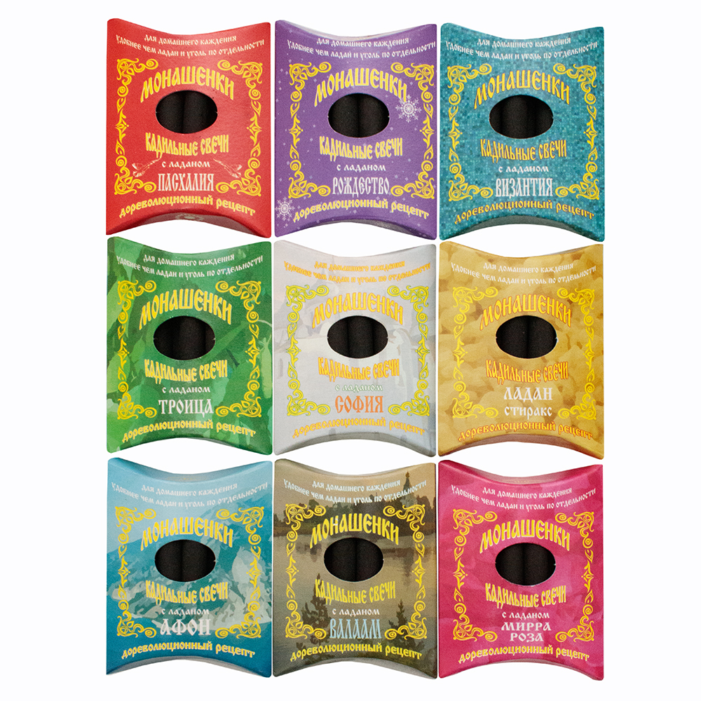 Традиционные православные кадильные свечки из ладана, ароматических компонентов и угля, которые при каждении издают легко узнаваемый аромат церковных служб. При горении благовония дают приятный нежный аромат и дымок, что удобно при каждении в жилых помещениях, даже при закрытых окнах. Ароматическая композиция традиционно составлена на основе натурального ладана и ароматических масел, произведенных в Греции.