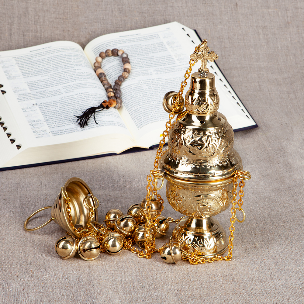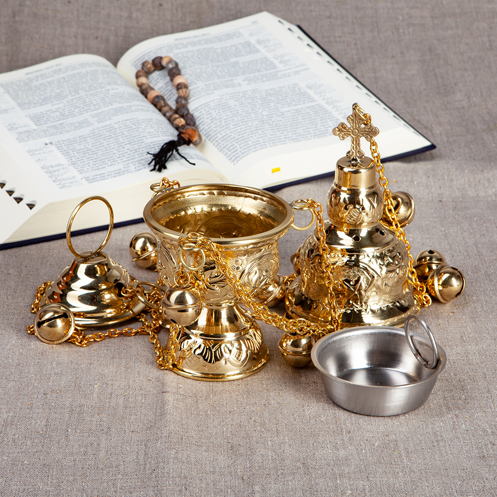 Кадило оригинальной вытянутой формы изготовлено из латунного сплава. Изделие украшено крестом в верхней части и чеканным растительным орнаментом. Чаша закреплена на длинных цепях с позвонцами для тихого звона во время каждения.