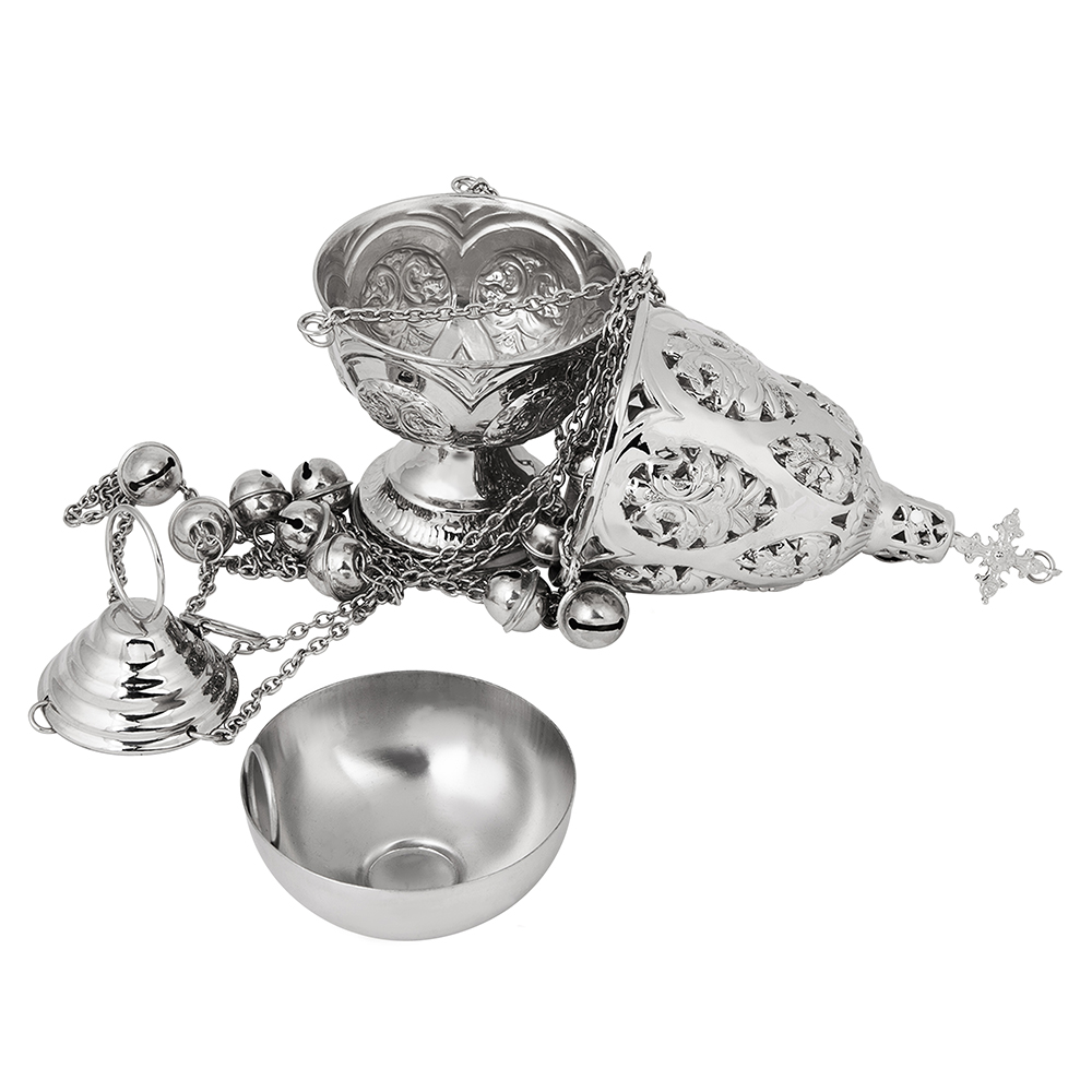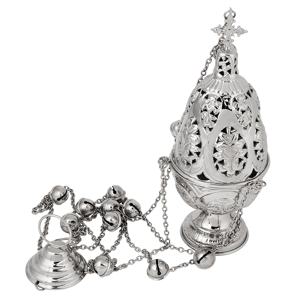 Кадило оригинальной овальной формы изготовлено из латунного сплава и покрыто тонким слоем никеля. Главным украшением изделия являются необычные ажурные вставки и рельефные узоры. Благодаря широкому основанию кадило можно поставить на аналой или на столик без риска опрокидывания и просыпания содержимого. Чаша закреплена на длинных цепях с позвонцами для тихого звона во время каждения.