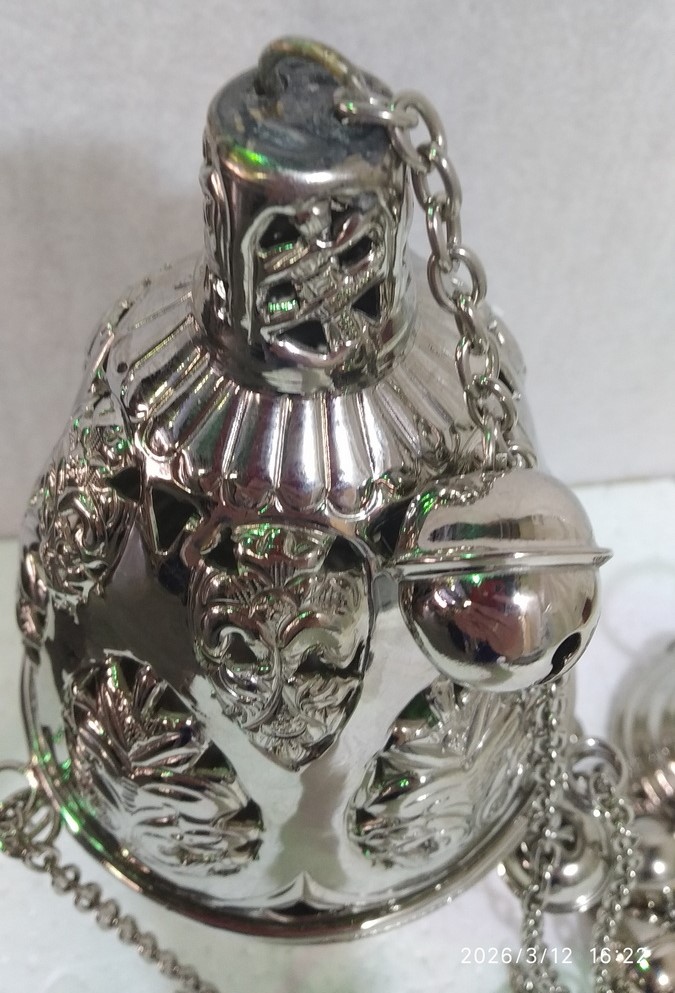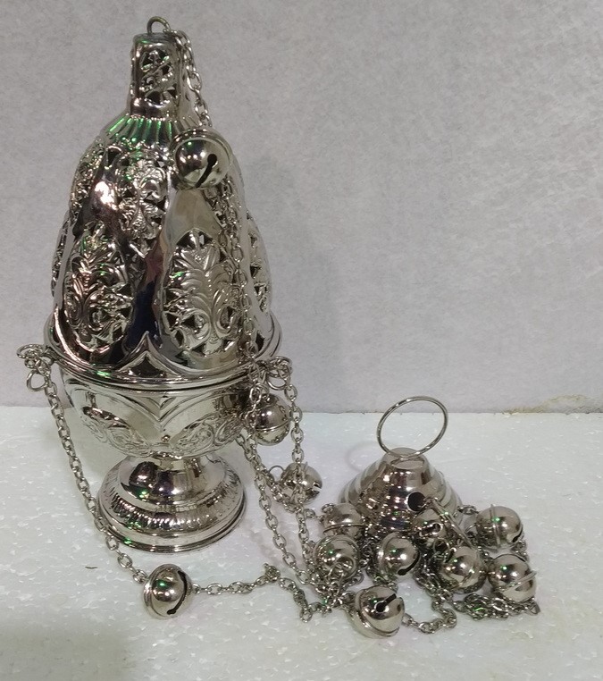 Кадило оригинальной овальной формы изготовлено из латунного сплава и покрыто тонким слоем никеля. Главным украшением изделия являются необычные ажурные вставки и рельефные узоры. Благодаря широкому основанию кадило можно поставить на аналой или на столик без риска опрокидывания и просыпания содержимого. Чаша закреплена на длинных цепях с позвонцами для тихого звона во время каждения.