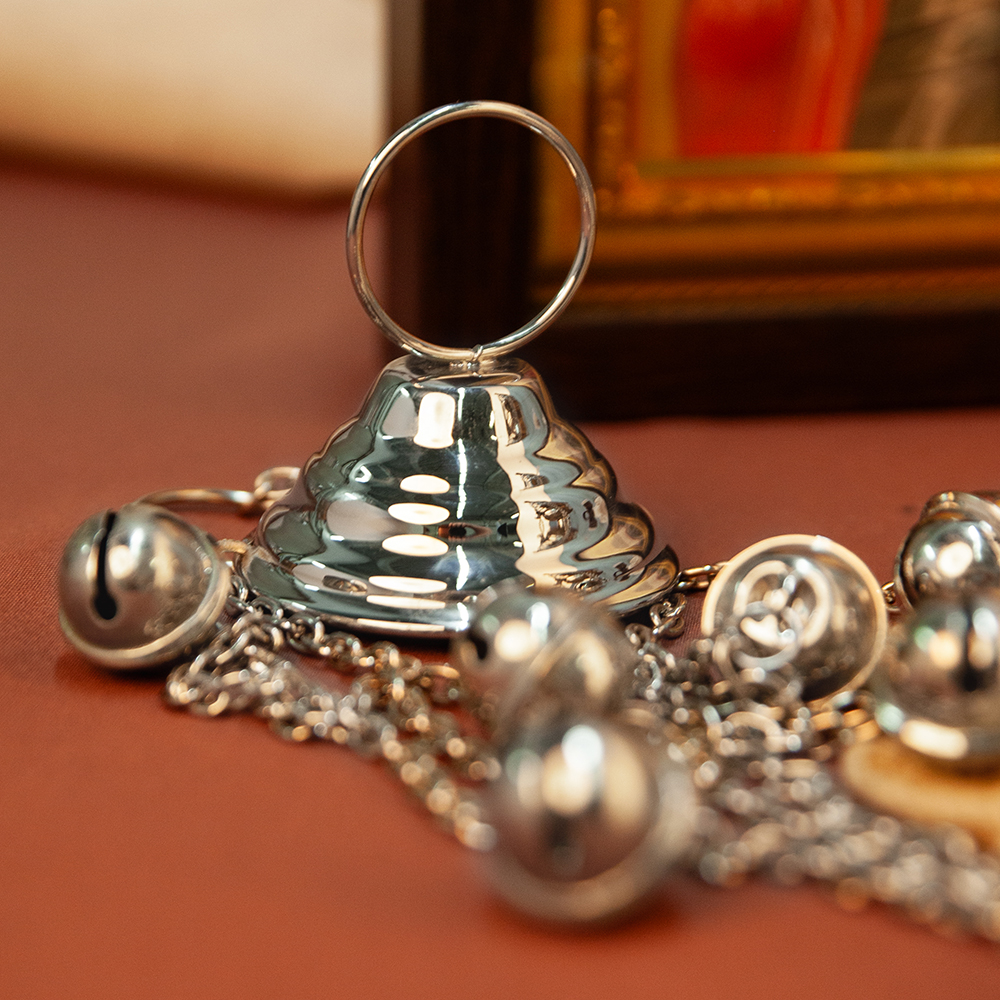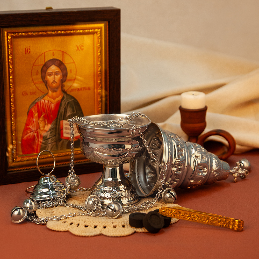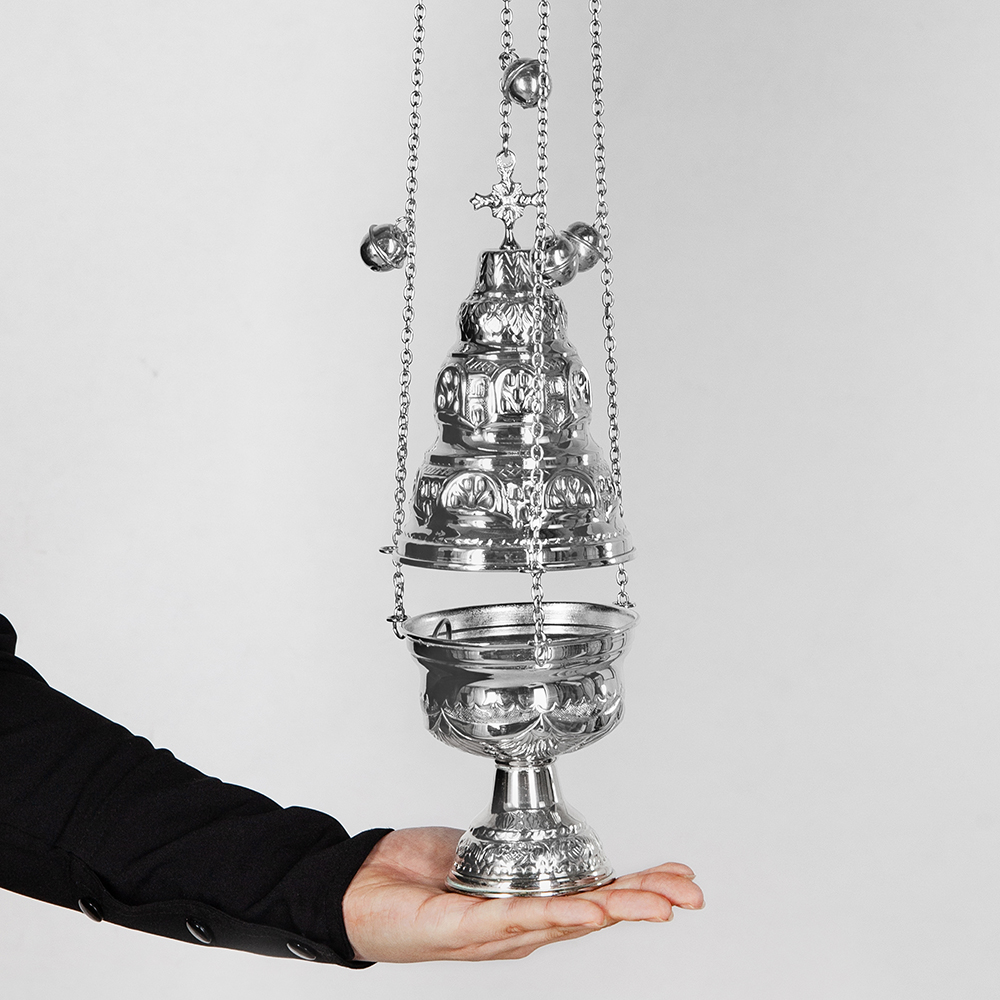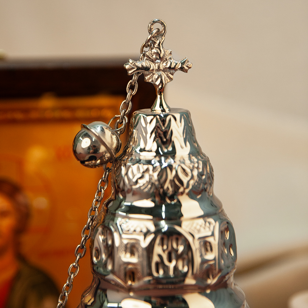 Кадило оригинальной формы на широком основании изготовлено из латунного сплава и покрыто тонким слоем никеля. Чаша закреплена на длинных цепях с позвонцами для тихого звона во время каждения.