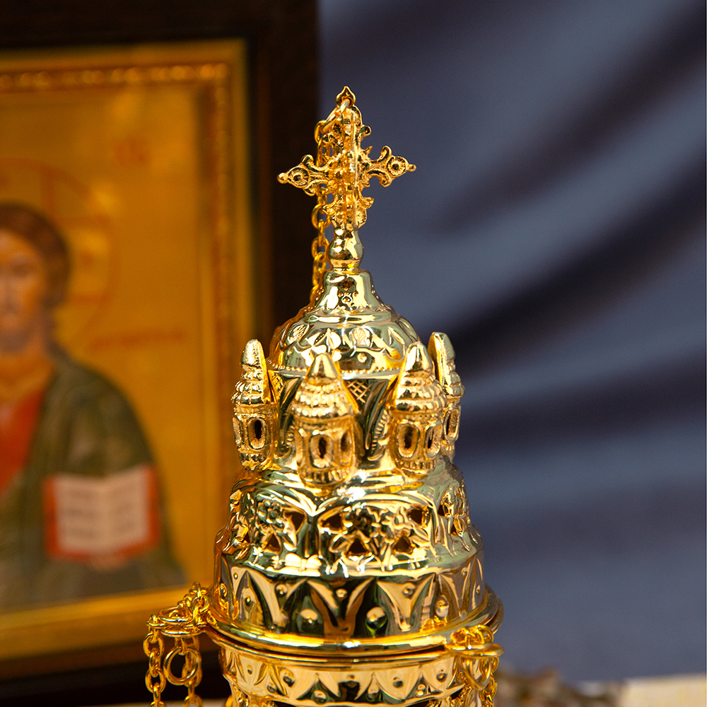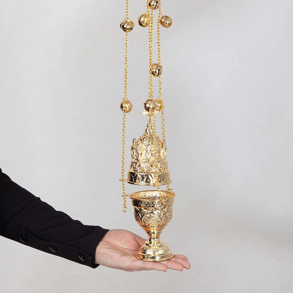 Кадило изготовлено из латунного сплава с последующим покрытием под золото. Двухслойная металлизация повышает износостойкость, обеспечивает защиту от окисления и надолго сохраняет золотой блеск изделия. Благодаря оригинальной форме кадило станет дополнительным украшением богослужения. А его устойчивое основание обеспечит безопасное каждение, предотвращая случайное выпадение горящего угля.