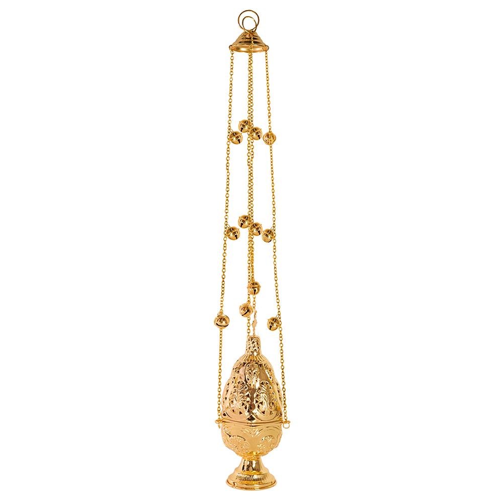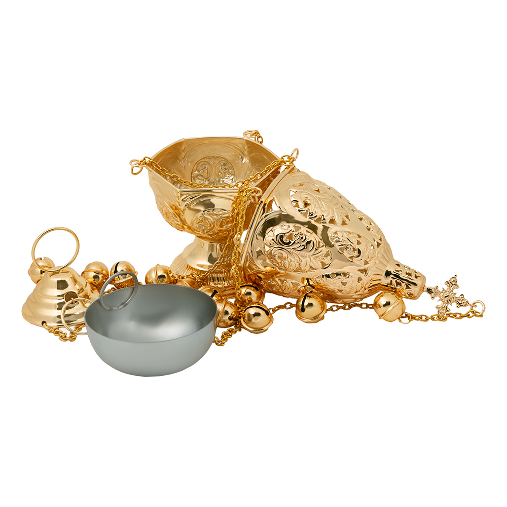 Кадило изготовлено из латунного сплава с последующим покрытием под золото. Двухслойная металлизация повышает износостойкость, обеспечивает защиту от окисления и надолго сохраняет золотой блеск изделия. Особую декоративность модели придают изящная ажурная крышка и рельефный узор на чаше. Благодаря широкому основанию кадило можно поставить на аналой или на столик без риска опрокидывания и просыпания содержимого. Чаша закреплена на длинных цепях с позвонцами для тихого звона во время каждения.