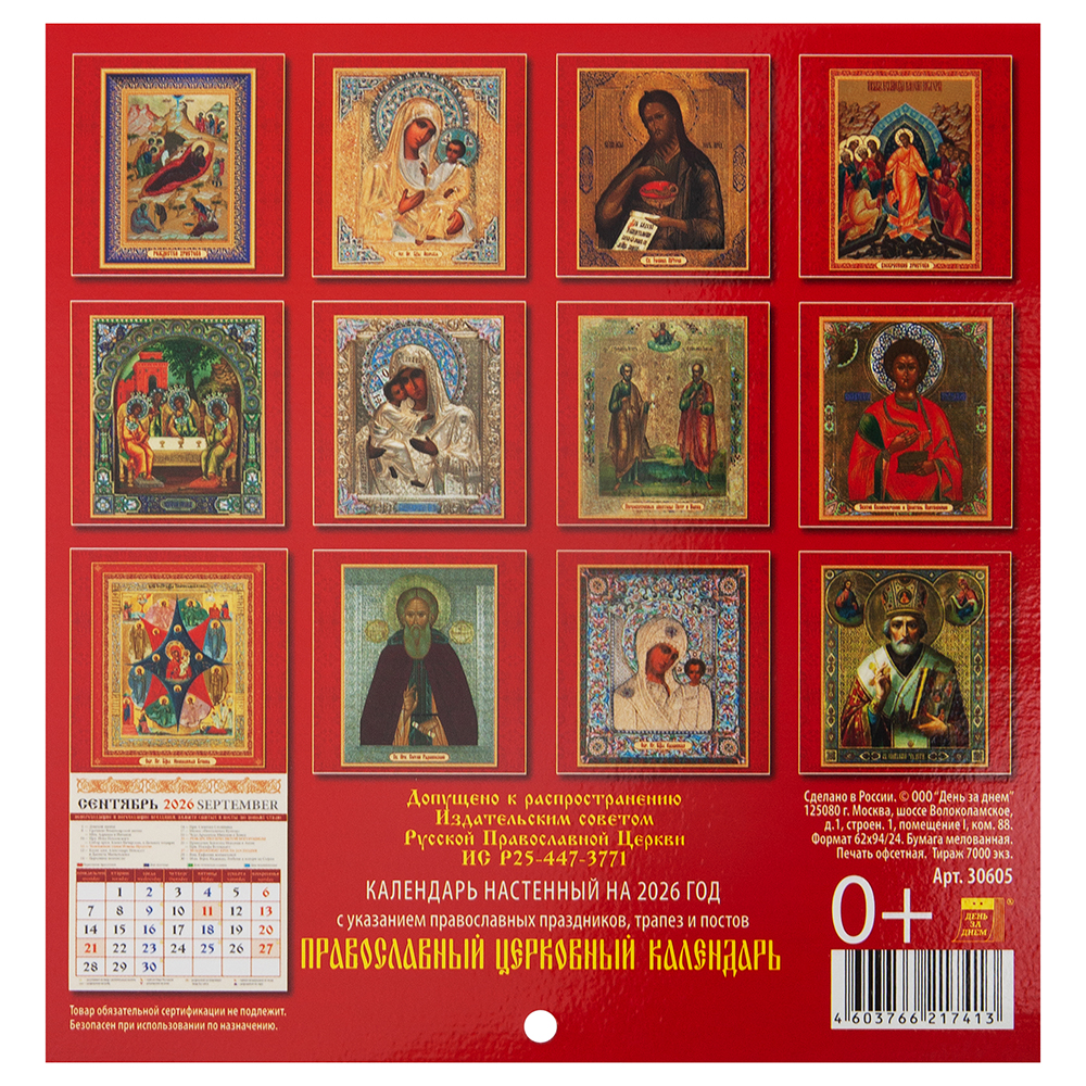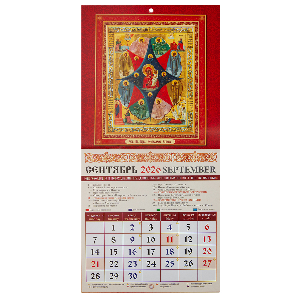 Яркий и красивый календарь на 2026 год с изображениями икон особо чтимых святых напомнит вам о церковных праздниках и постах, днях памяти святых.