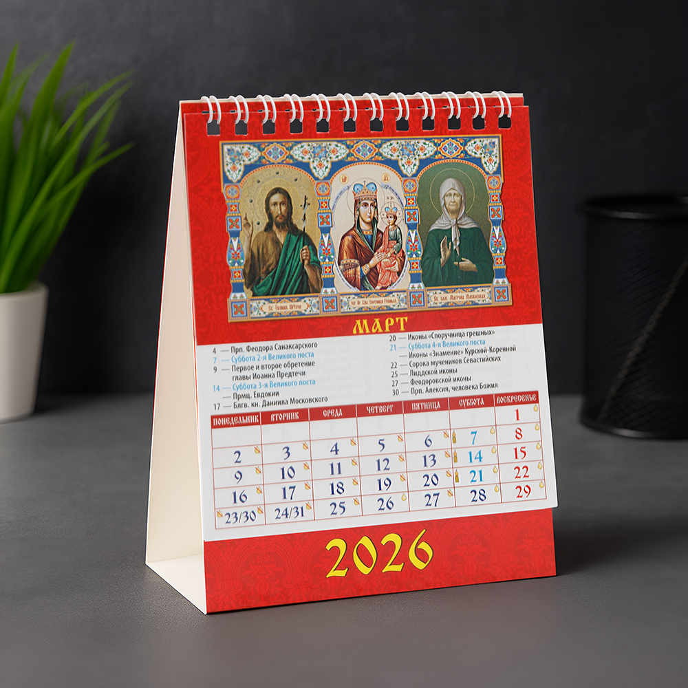 Настольный перекидной календарь на 2026 год напечатан в соответствии с официальным церковным календарем Русской Православной Церкви. В календаре указаны даты основных церковных праздников, отмечены периоды постов.