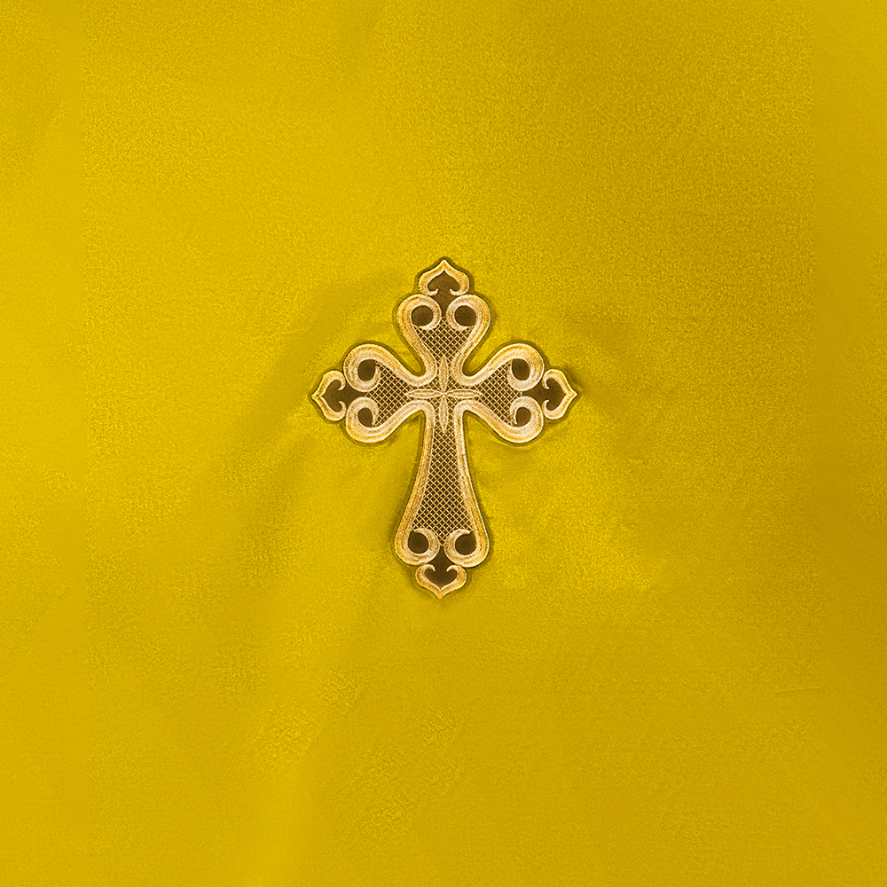 Катапетасма из креп-сатина с вышитым на машине накладным крестом в желтом цвете.