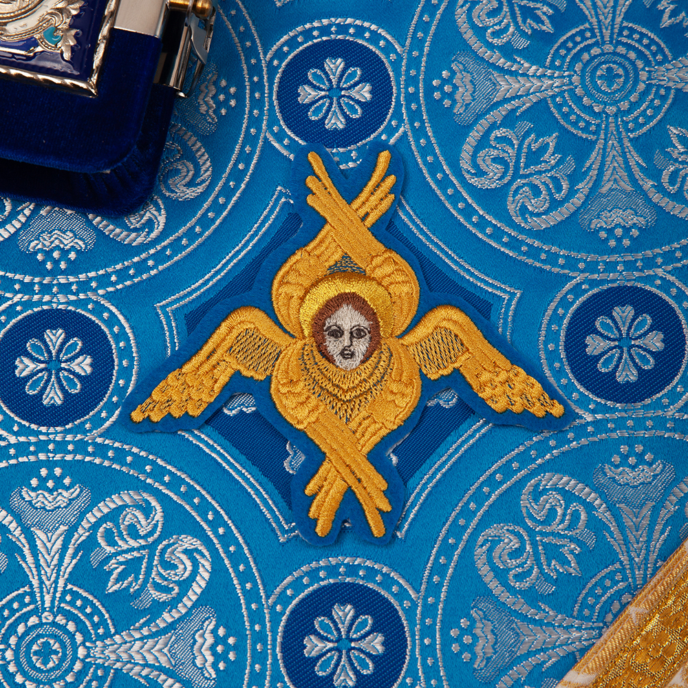 Пришивные херувимы для декорирования церковного облачения изготовлены из качественных материалов по технологии машинной вышивки. Основа изделий – плотный фильц, изображения на котором выполнены цветной металлизированной нитью. В наличии имеются изделия разных оттенков, подобрать которые можно с учетом принятой символики богослужебных облачений.