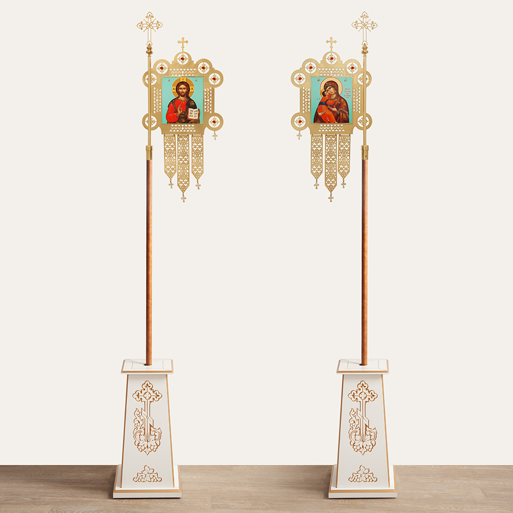 Комплект хоругвей изготовлен из латуни. Главное украшение изделий – богатая резьба на прочном металлическом древке, которое венчает навершие с четырехконечным крестом. Иконы Спасителя и Божией Матери «Владимирская» выполнены по технологии печати на холсте и отличаются яркостью и высокой степенью детализации. Покрытие защитным лаком защищает изображения от выцветания и порчи. Ажурные элементы в рамках хоругвей дополнены вставками с цветными камнями. Подвесные фрагменты в нижней части хоругвей закреплены на проволочных подвесах. Благодаря тщательной полировке металлическая поверхность имеет привлекательный блеск.