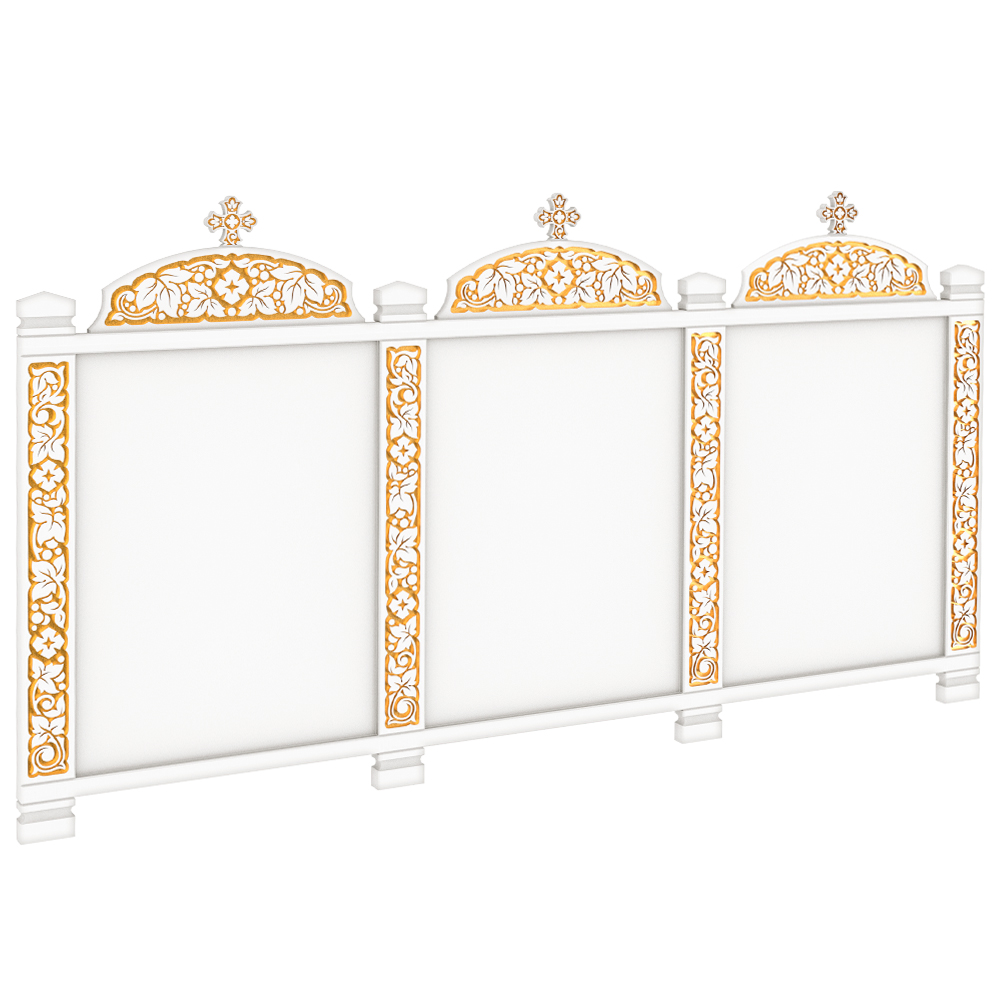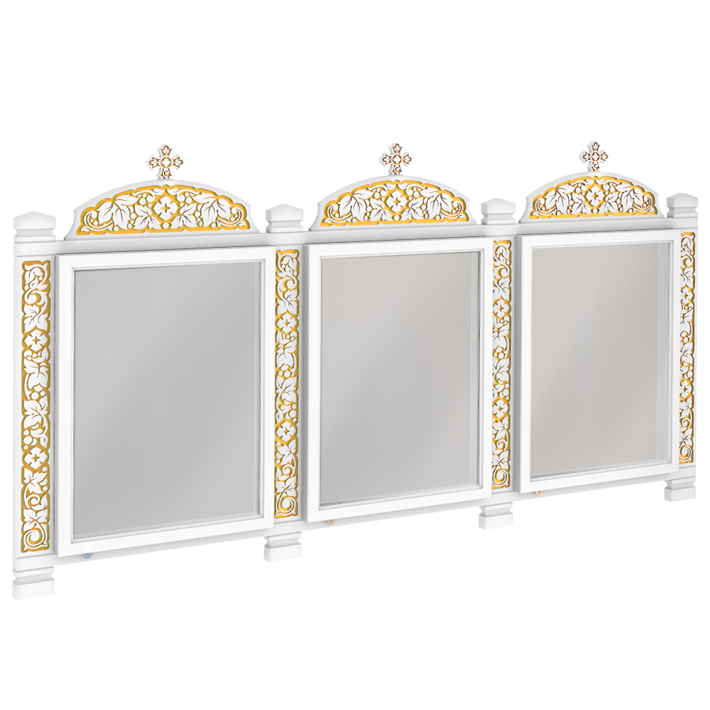 Настенный киот изготовлен из дерева и тонирован в белый с золотом. Центральная часть изделия выполнена в виде секций для размещения трех икон. Деревянная поверхность украшена орнаментом «виноградная лоза», нанесенным методом рельефной гравировки, композицию венчают четырехконечные кресты. Открывающаяся конструкция рамок позволит менять иконы. Также возможно изготовление изделия без рамки под постоянное размещение конкретной иконы, менять которую не планируется. Размер внутреннего пространства киота может меняться в соотвествии с пожеланиями заказчика.