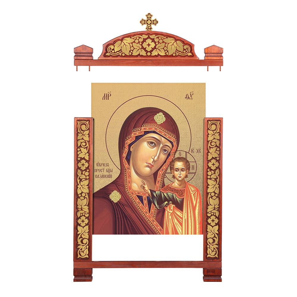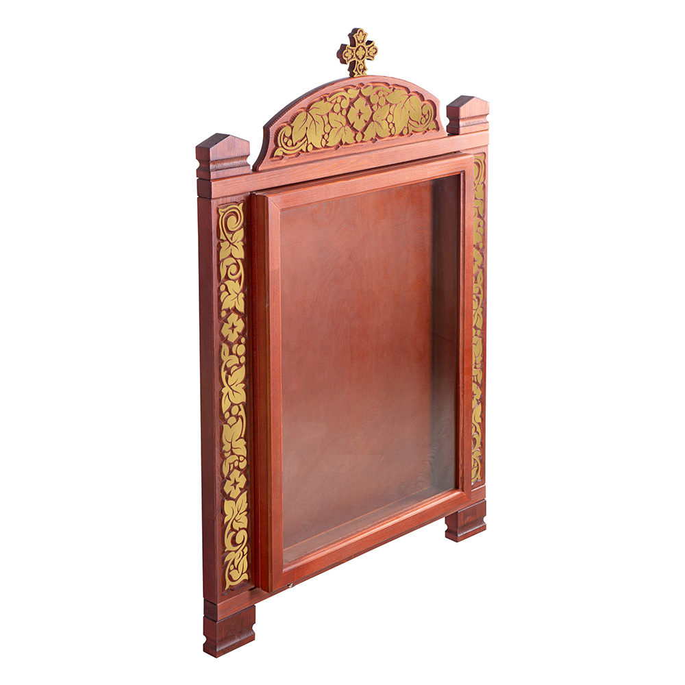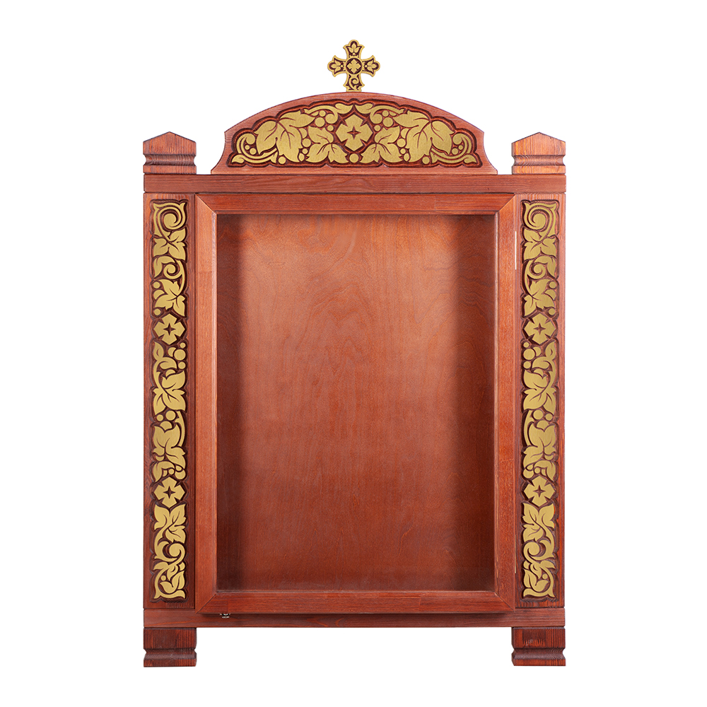 Настенный киот «Суздальский» изготовлен из дерева. Место под икону оформлено рамой с резным орнаментом «виноградная лоза». Верхняя часть украшена растительным узором и увенчана четырехконечным крестом. Возможно изготовление модели с рамкой или без рамки.