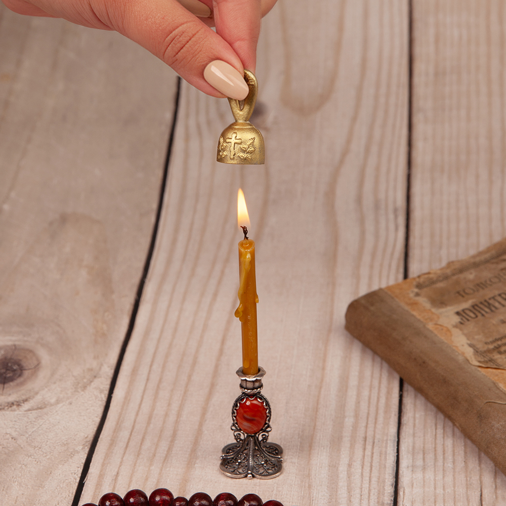 Колпачок для тушения свечей отлит из металлического сплава. Он позволяет погасить свечу на церковном подсвечнике удобно и безопасно. Благодаря небольшому размеру, колпачок для тушения свечей можно носить с собой и применять как в храме, так и дома.