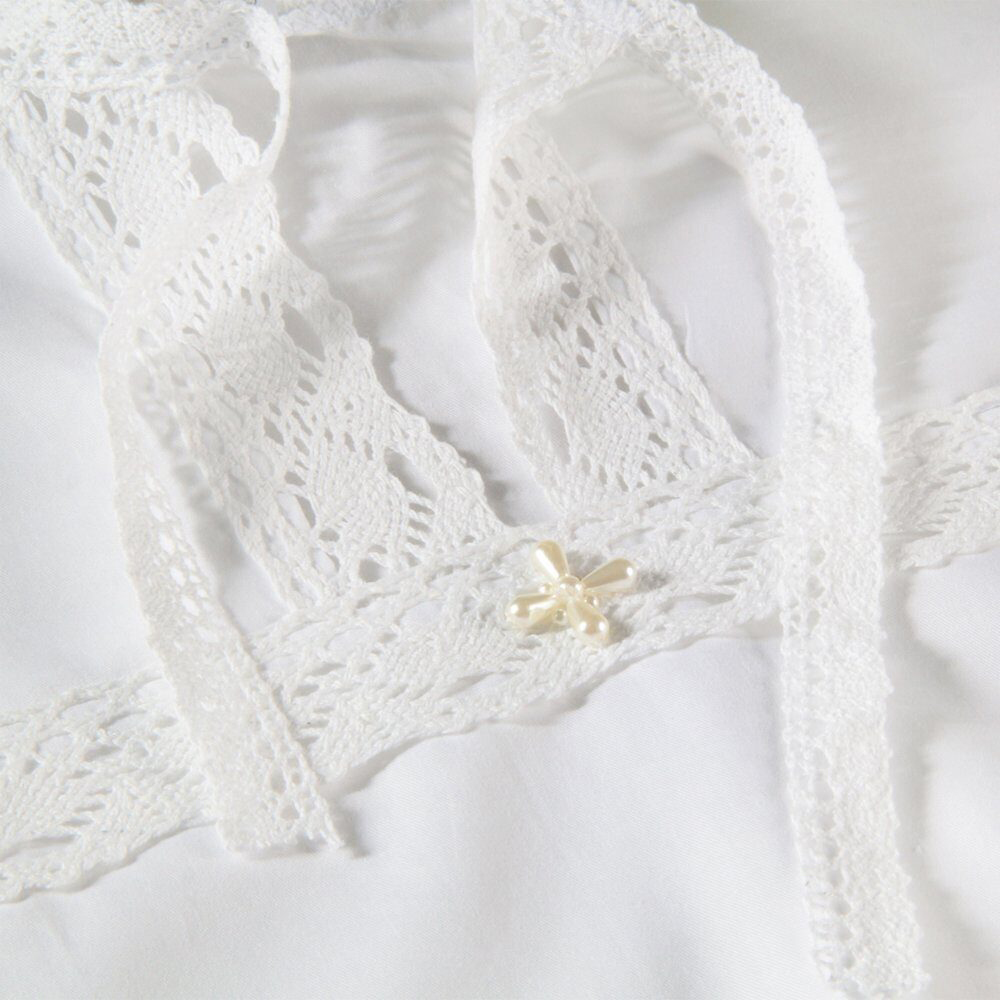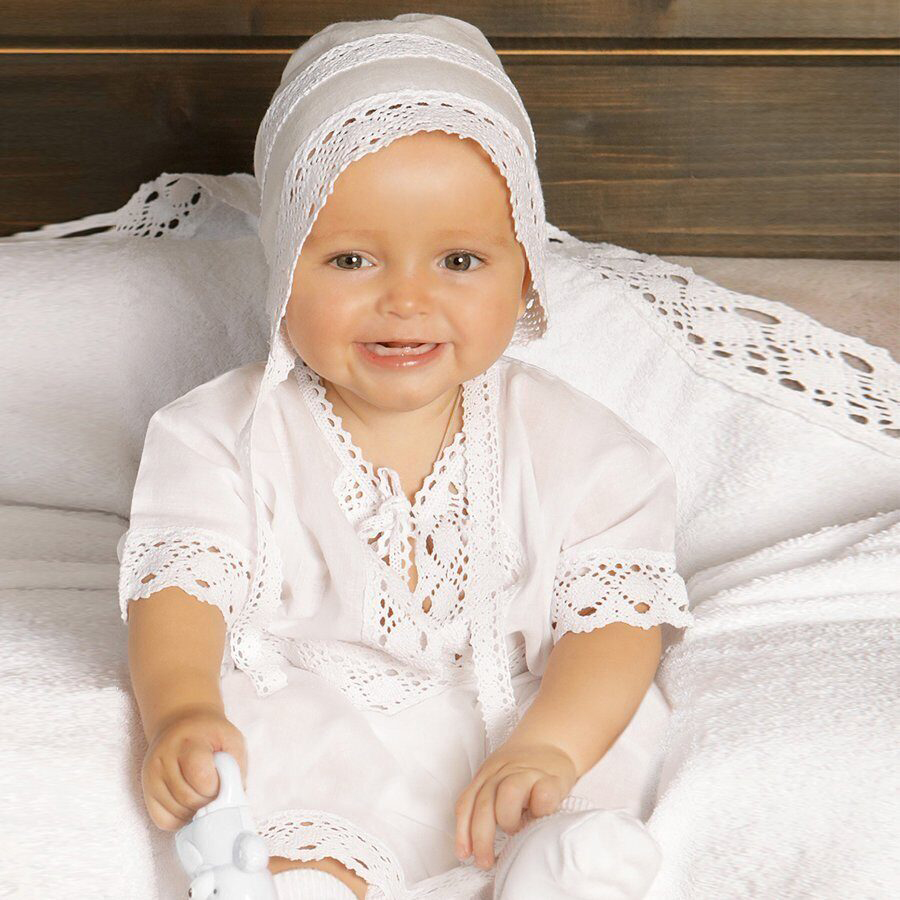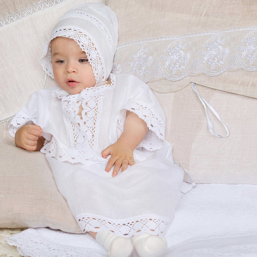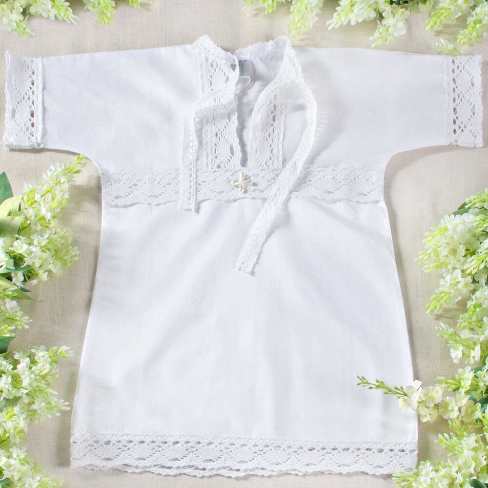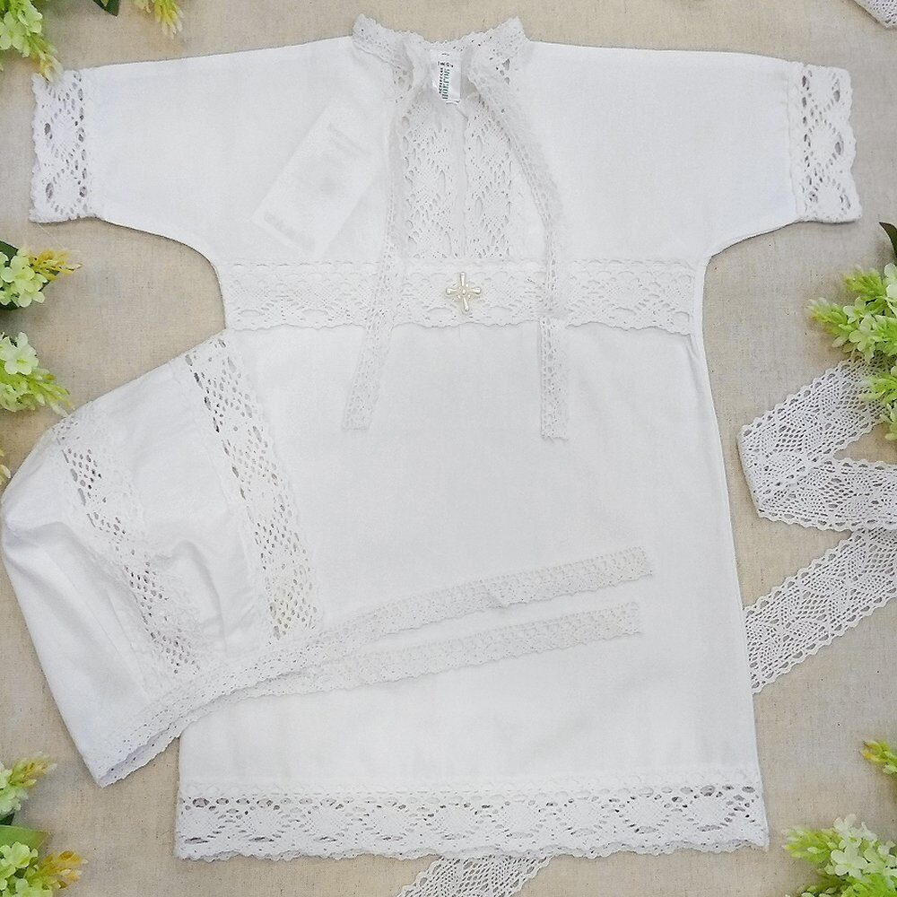 В этом комплекте для крещения, состоящем из платья и чепчика, малыши будут выглядеть очень трогательно. Сорочка свободного кроя и длиной до пят прикроет ножки младенца во время крещения. А благодаря широкому вырезу с завязками, ее будет легко надеть после погружения в купель. Изделия украшены нежным хлопковым кружевом, на рубашке бусинами вышит православный крестик.