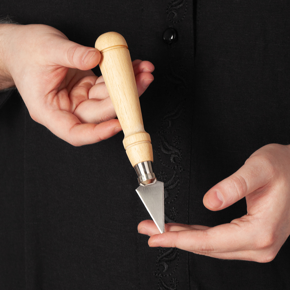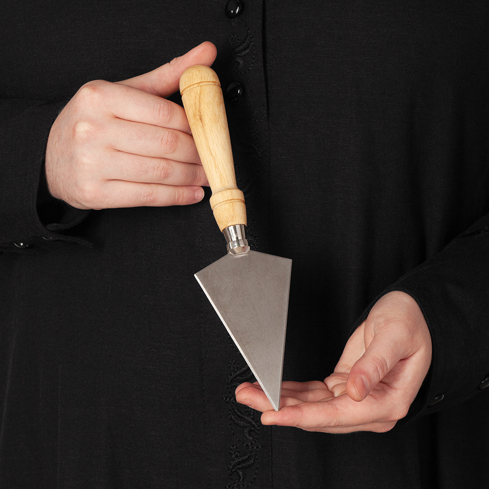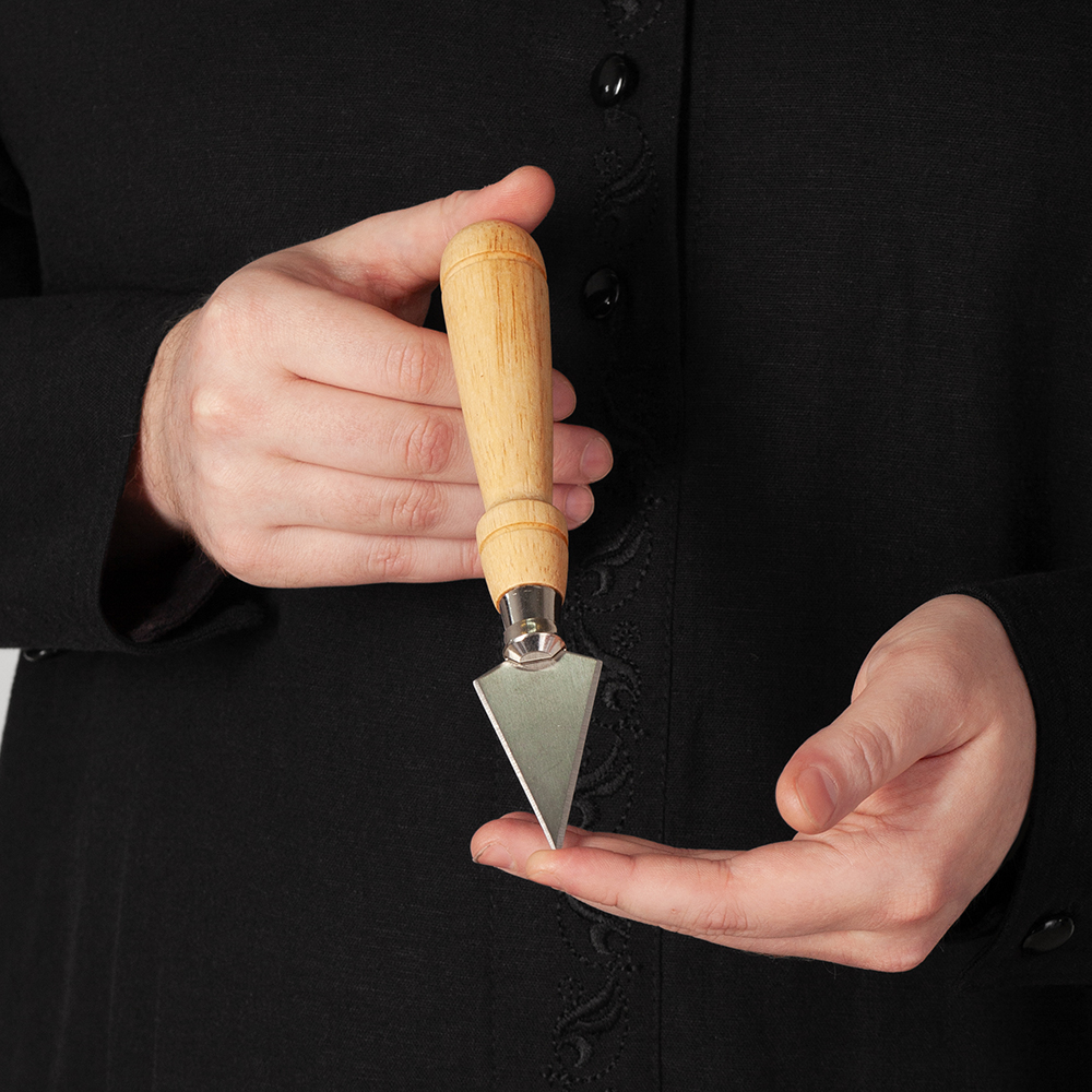 Копия изготовлены из нержавеющей стали. Для ручки использована натуральная древесина. Декоративный вид изделию придает тщательная полировка поверхности. Острое лезвие упрощает заготовление Святых Даров и не требует дополнительного затачивания.