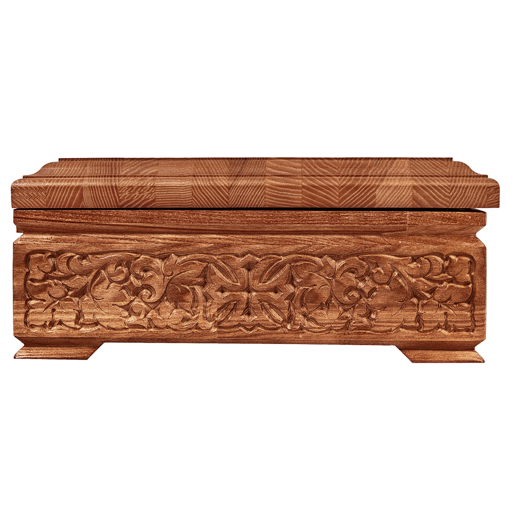 С внутренней стороны крышка ковчега украшена резным орнаментом. На ней также помещена надпись “Дивен Бог во святых своих”, нанесенная при помощи лазерной гравировки.
