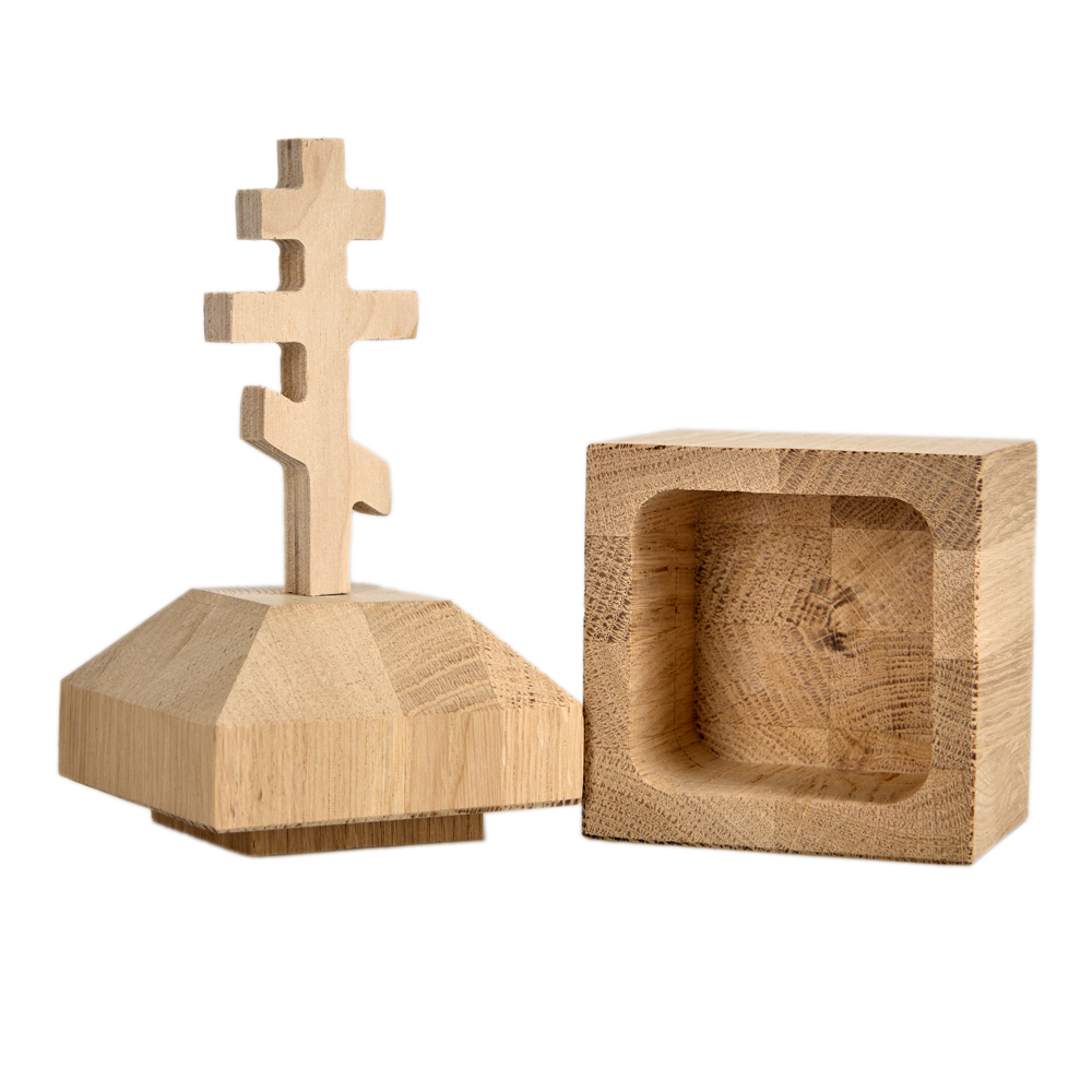 Ковчег для хранения мощей под престолом изготовлен из натуральной древесины дуба. Его закрывает высокая крышка в форме усеченной пирамиды. Восьмиконечный крест на крышке вырезан из фанеры. Устойчивая конструкция ковчега с толстыми стенками надежно защищена от любого внешнего воздействия и гарантирует благоговейное хранение мощей.
