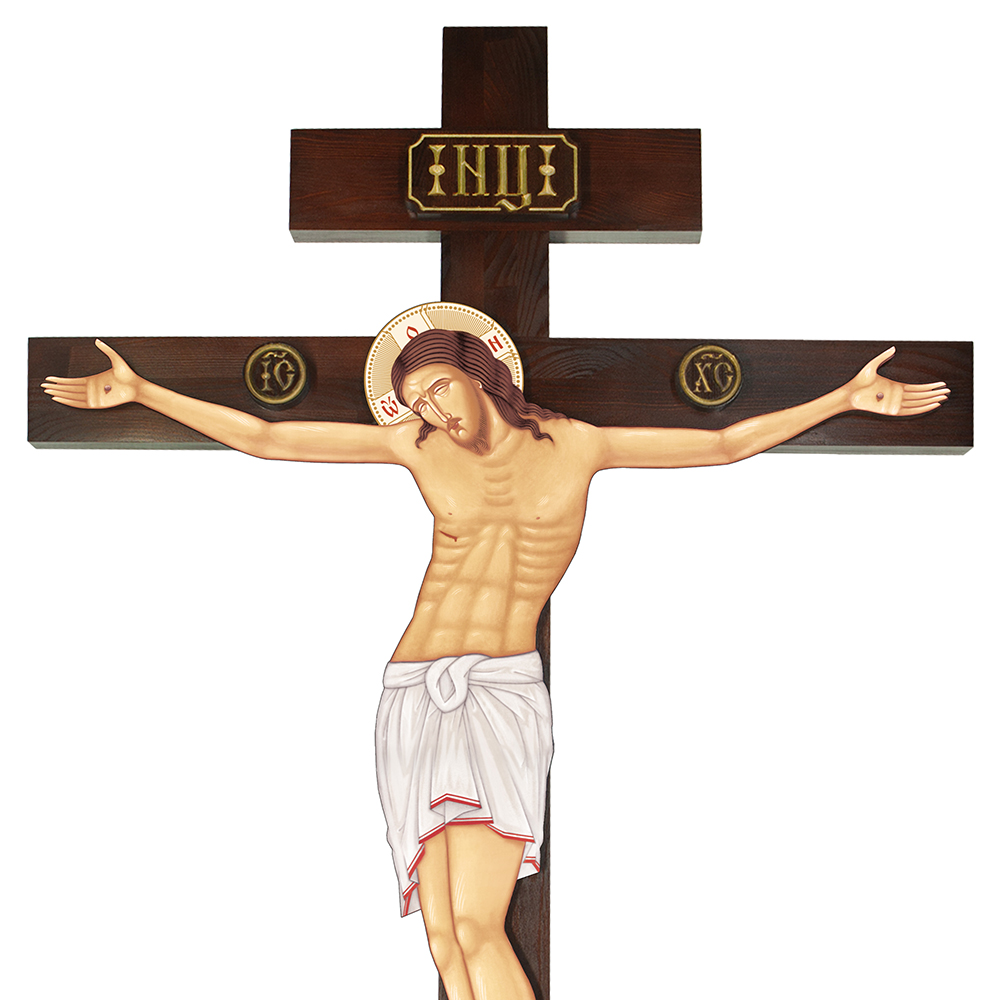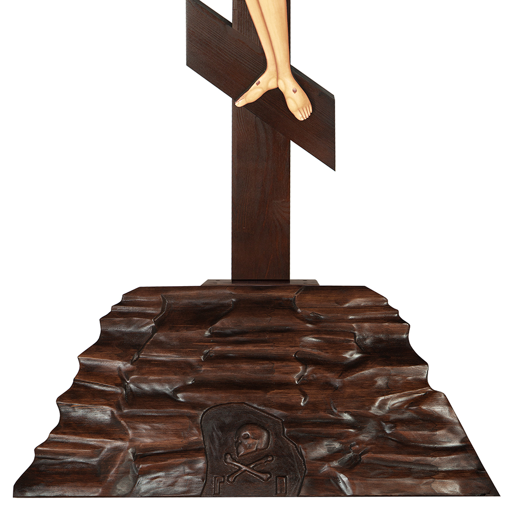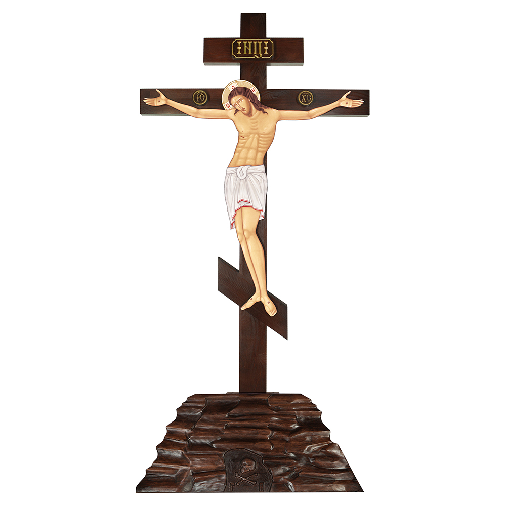 Напольная крест-голгофа изготовлена из натуральной древесины сосны. Изображение Распятия выполнено по технологии цветной печати на качественной МДФ, рельеф горки — методом профессиональной резьбы по дереву. Возможно изготовление конструкции разной высоты от 180 до 300 см, рассчитайте оптимальный вариант с учетом особенностей храмового пространства и укажите его при оформлении заказа.