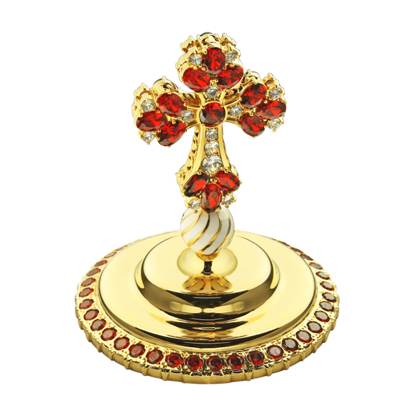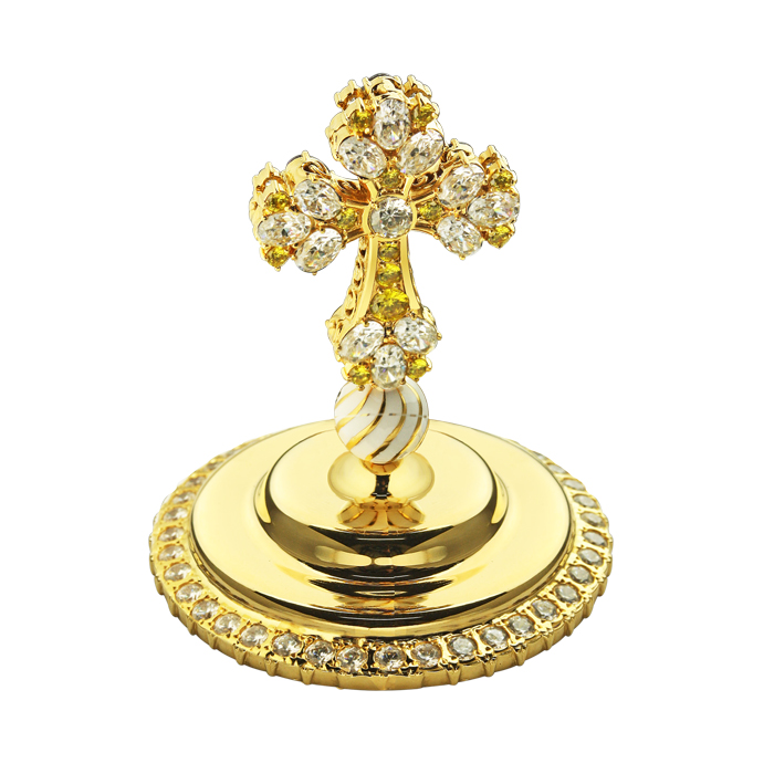 Крест на митру изготовлен из ювелирного сплава и покрыт тонким слоем золота гальваническим способом. Гальваническое золочение гарантирует неизменный вид изделия на очень длительный срок и простоту в уходе. Крест декорирован вставками фианитов отличного качества ручной закрепки. Крест установлен на литьевой шарик, акцентированный ручным нанесением качественной эмали. Изделие упаковано в презентабельную кожвиниловую упаковку с бархатным ложементом.