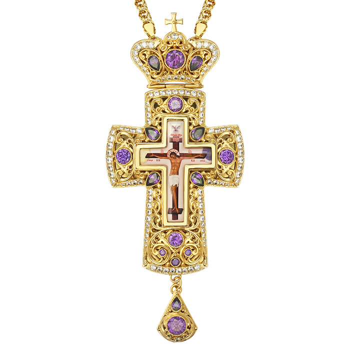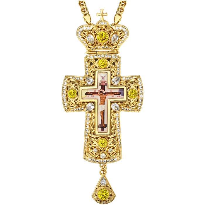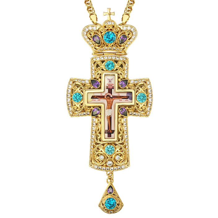Позолоченный крест из ювелирного сплава выполнен в традиционной четырехконечной форме с оглавием в виде венца и подвеской. Распятие вмонтировано в литьевую оправу, украшенную ажурным орнаментом. Изображение Распятия изготовлено с помощью техники многоцветной печати на ювелирном сплаве с нанесением защитного покрытия. Спокойные переливы позолоты подчеркивают насыщенные цвета камней, придавая кресту праздничную торжественность. Покрытие позолотой обеспечивает изделию долговечность декоративно-эстетических свойств, повышает его износостойкость. Такие качества достигаются в результате гальванического способа позолоты, благодаря хорошему сцеплению на молекулярном уровне покрытия и основы. Вставки фианитов закреплены вручную, что гарантирует надежную посадки и подчеркивает красоту камня. Наперсный крест поставляется в качественной упаковке в комплекте с цепью.