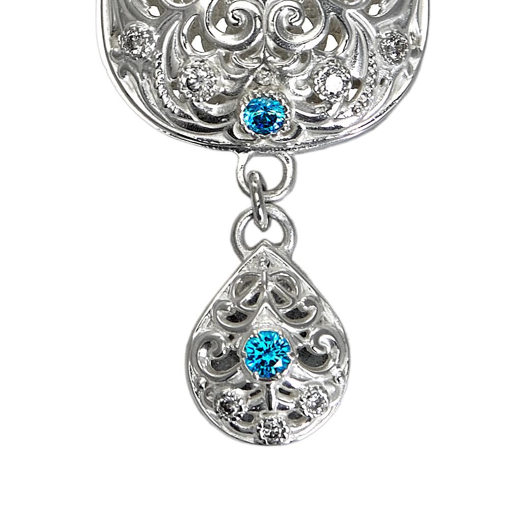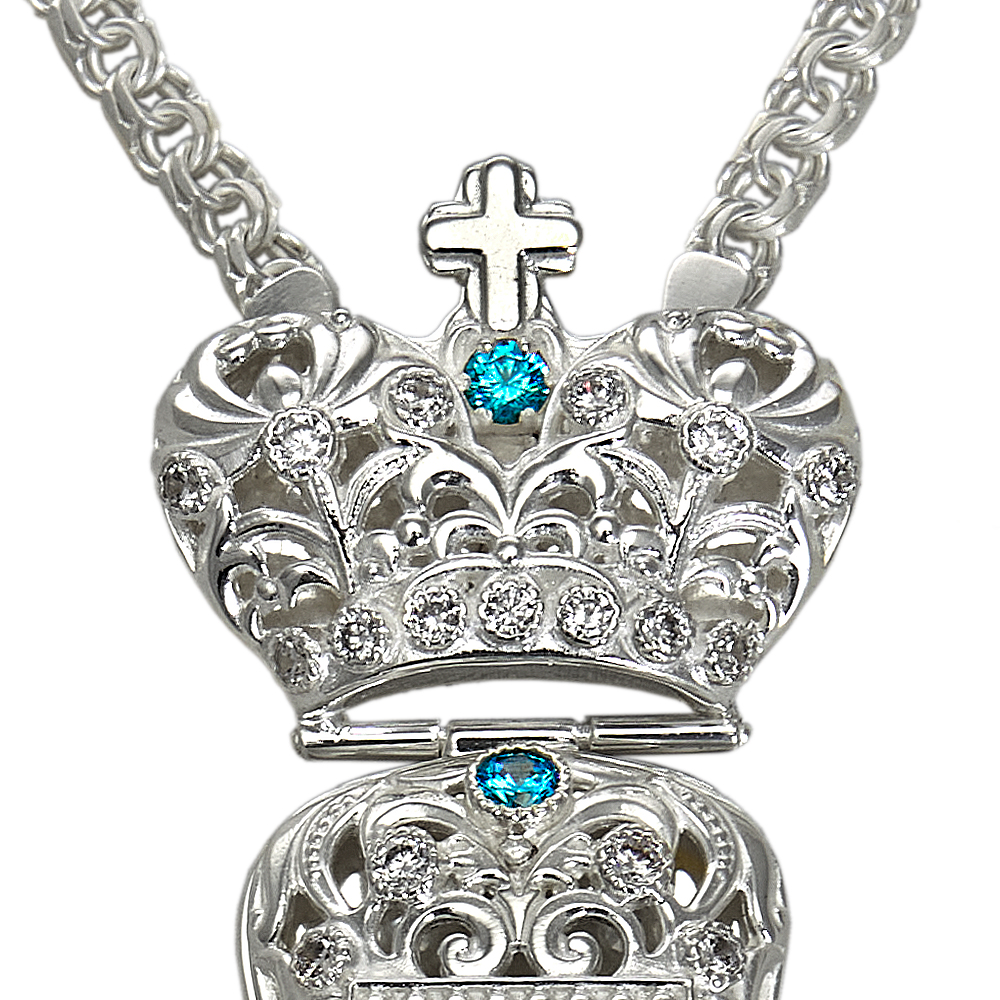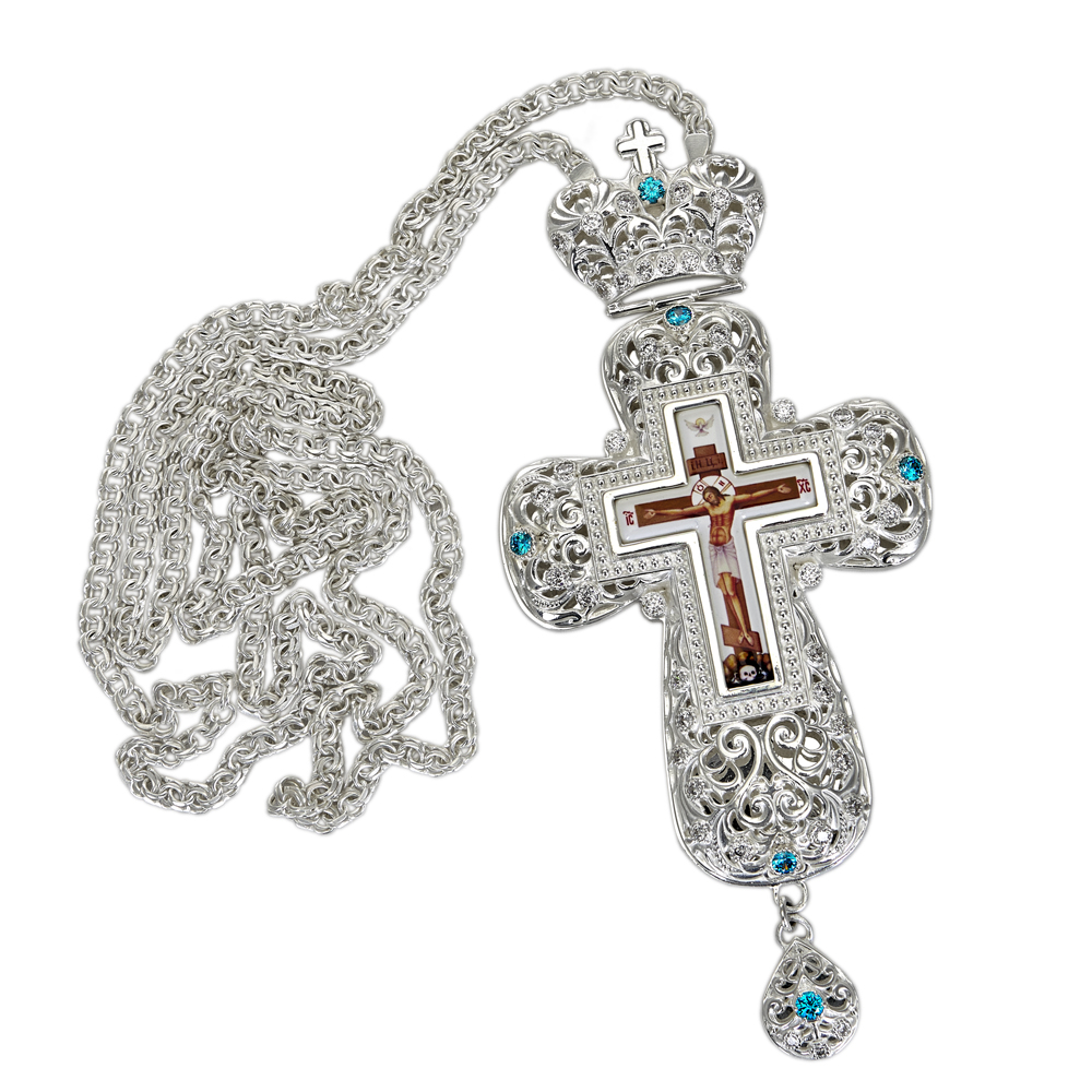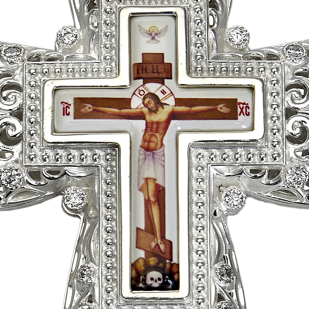 Наперсный крест из ювелирного сплава в серебрении с фианитами.