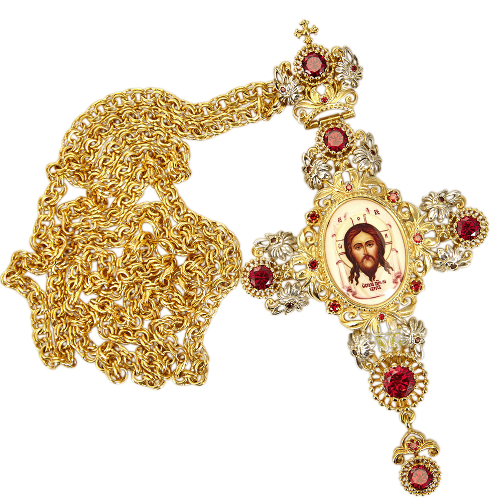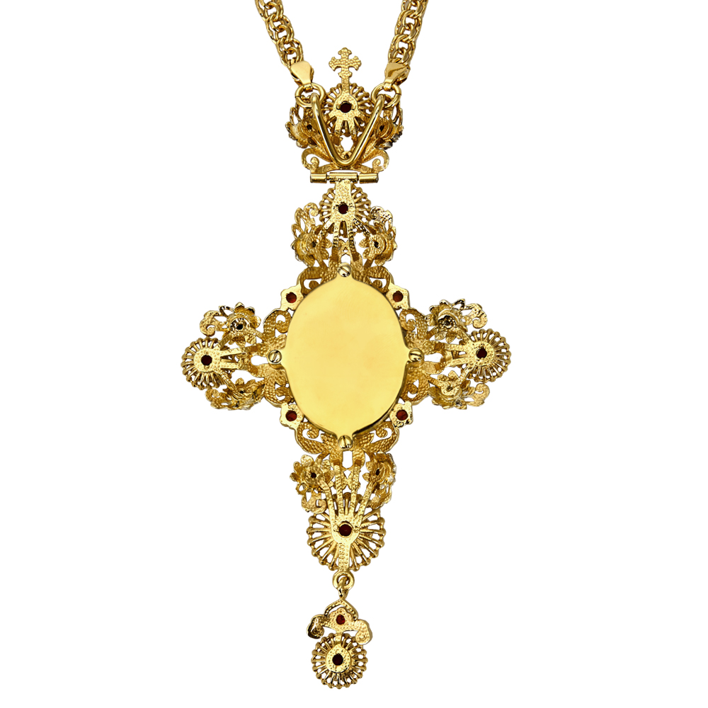 Крест наперсный из ювелирного сплава в позолоте с цепью, деколь, 7,7х14 см