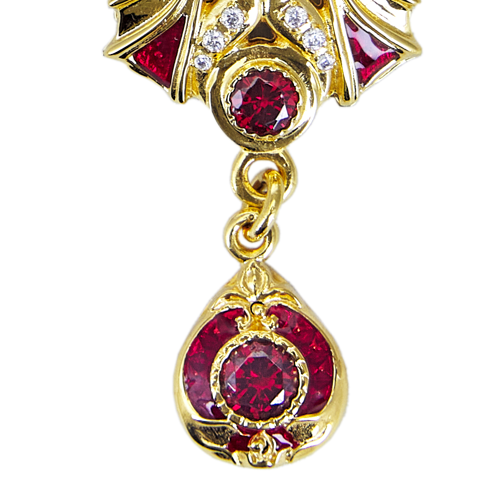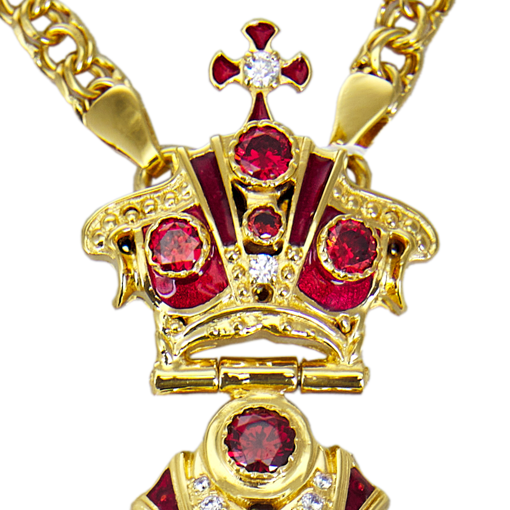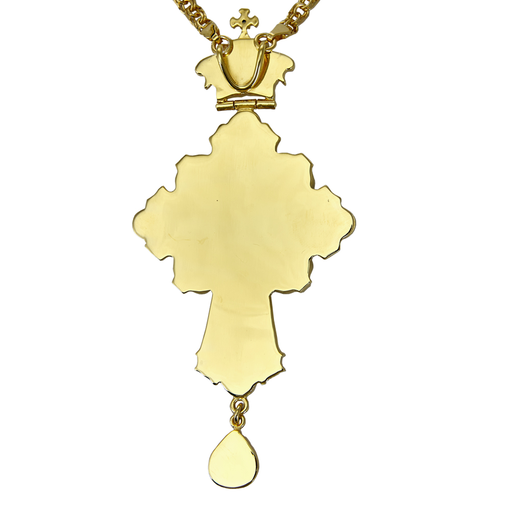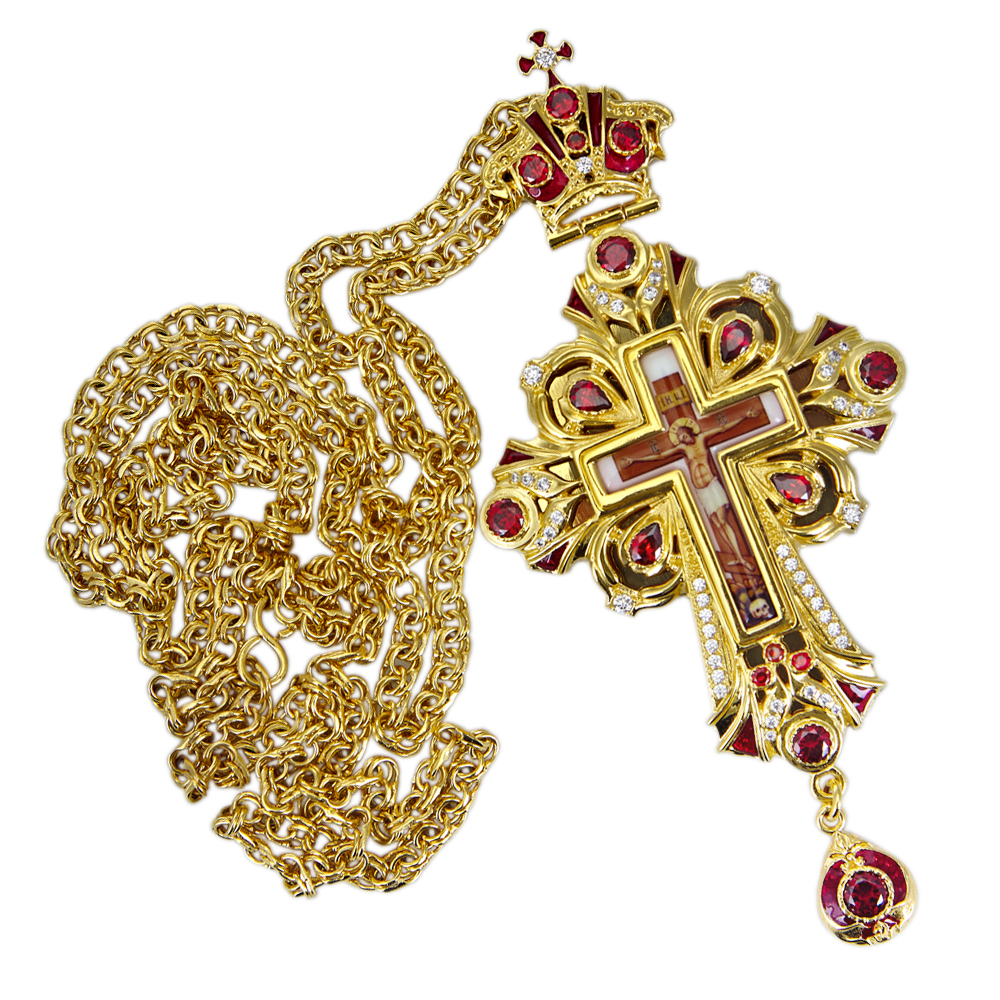Наперсный крест необычной формы среднего размера изготовлен из ювелирного сплава и покрыт золотом 999,9 пробы, нанесенной гальваническим способом. Распятие выполнено по специальной технологии нанесения цветного изображения на основу из ювелирного сплава, оно покрыто составом, предохраняющим его от механических повреждений и воздействия света. Крест декорирован вставками фианитов и небольшим количеством эмали. Камни закреплены вручную, что гарантирует их нахождение на своих местах на весь период ношения креста.