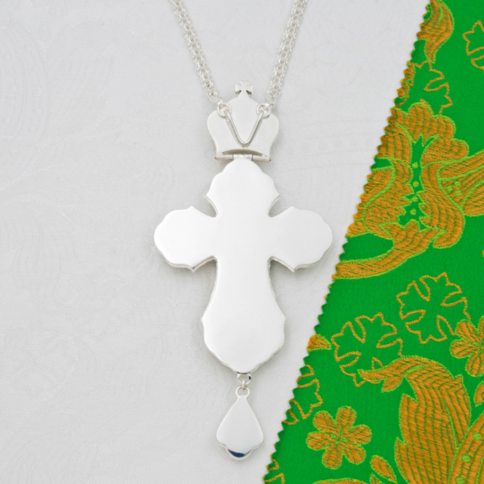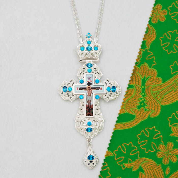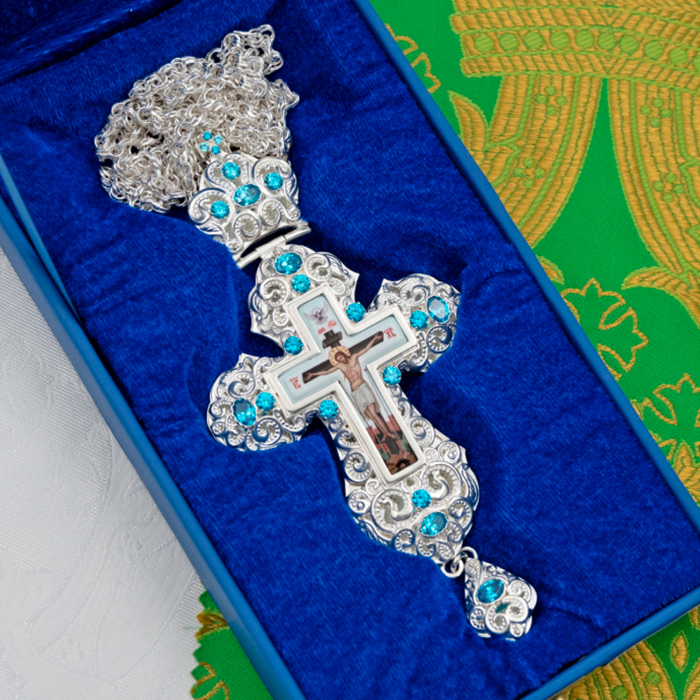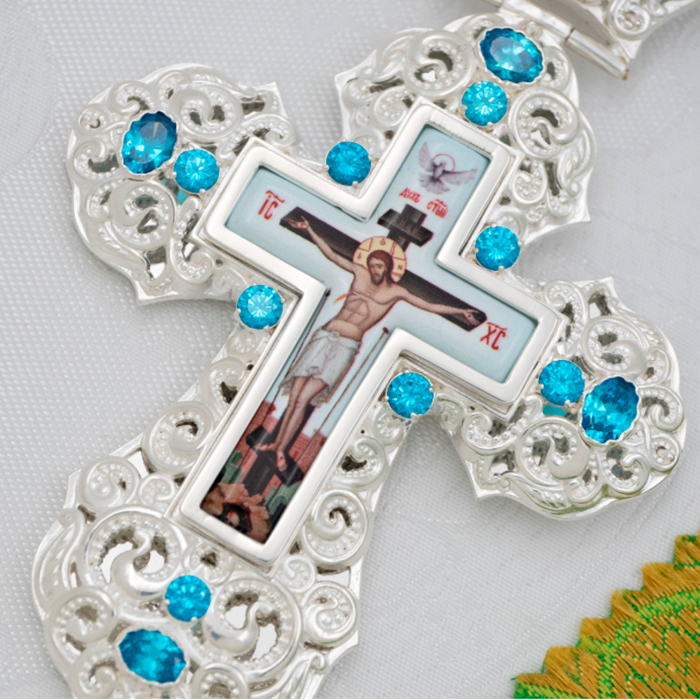 Наперсный крест из ювелирного сплава в серебрении с фианитами.