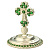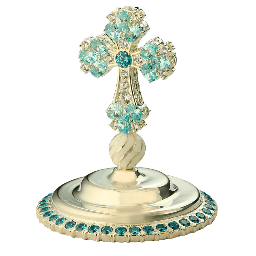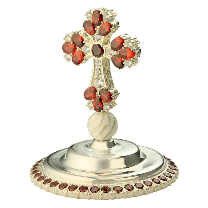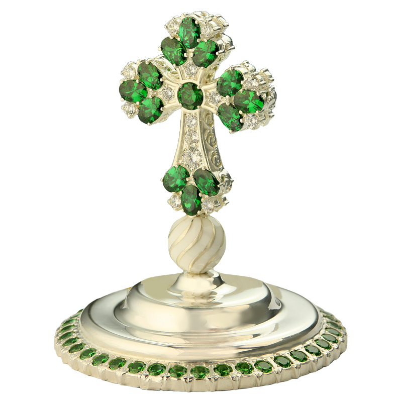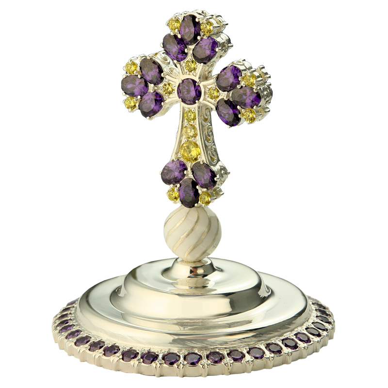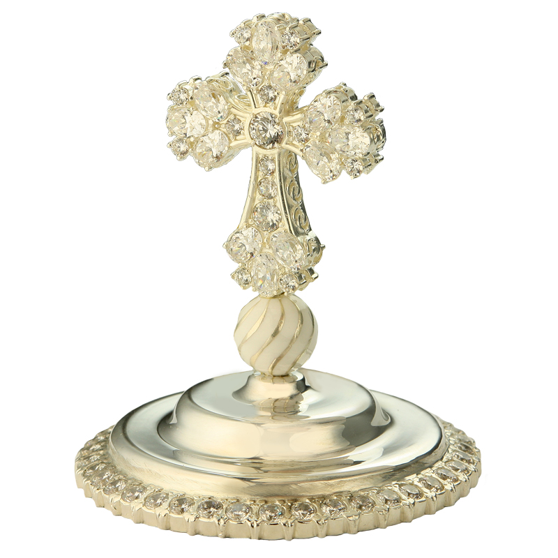 Архиерейский крест на митру изготовлен из ювелирного сплава и покрыт покрыт тонким слоем серебра, нанесенным гальваническим способом. Гальваническое серебрение гарантирует неизменный внешний вид изделия на длительное время и простоту в уходе. Крест декорирован россыпью фианитов различного размера и формы огранки, они отменного качества и закреплены вручную. Шарик, на который установлен крест, покрыт эмалью. Изделие реализуется в презентабельной кожвиниловой упаковке с бархатным ложементом.