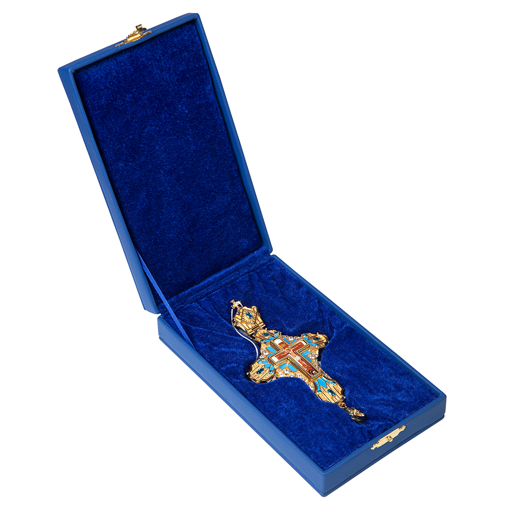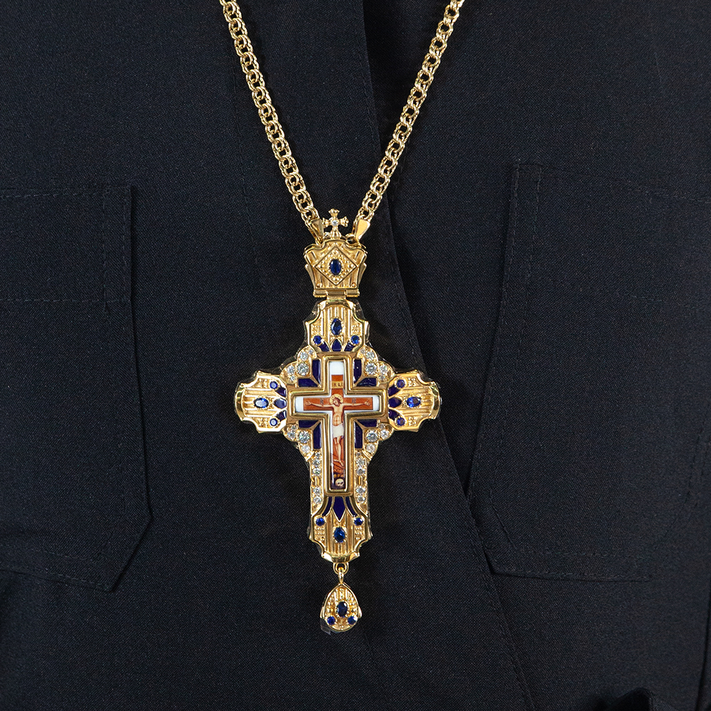 Крест наперсный из ювелирного сплава в позолоте, эмаль, фианиты, 7х14 см