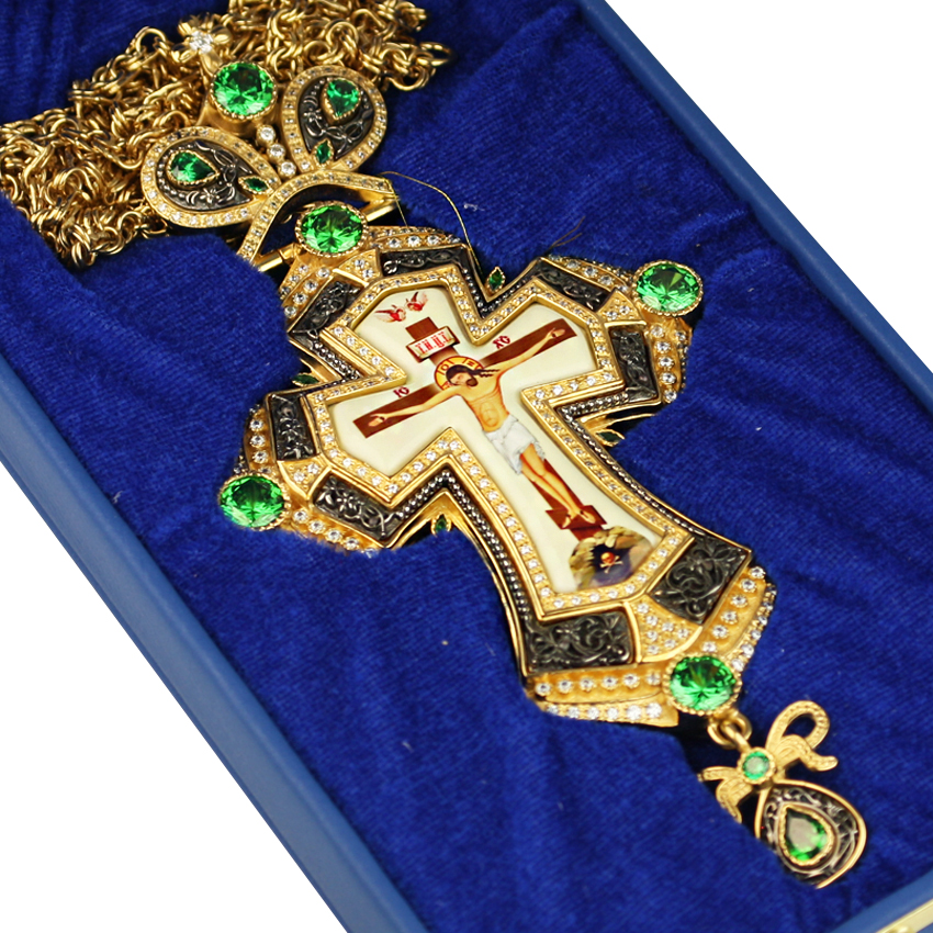 Крест наперсный оригинальной формы изготовлен из ювелирного сплава, специально созданного для производства ювелирных изделий. Крест покрыт качественной позолотой при помощи технологии гальваника, благодаря которой покрытие драгоценным металлом получается очень долговечным и надежным. Распятие выполнено по специальной технологии нанесения цветного изображения на металлическую основу и покрыто защитным слоем, предохраняющим его от выгорания цвета и повреждений. Лицевая сторона креста декорирована орнаментом, вставками фианитов и чернением. Изделие продается в презентабельной подарочной упаковке с бархатным ложементом.