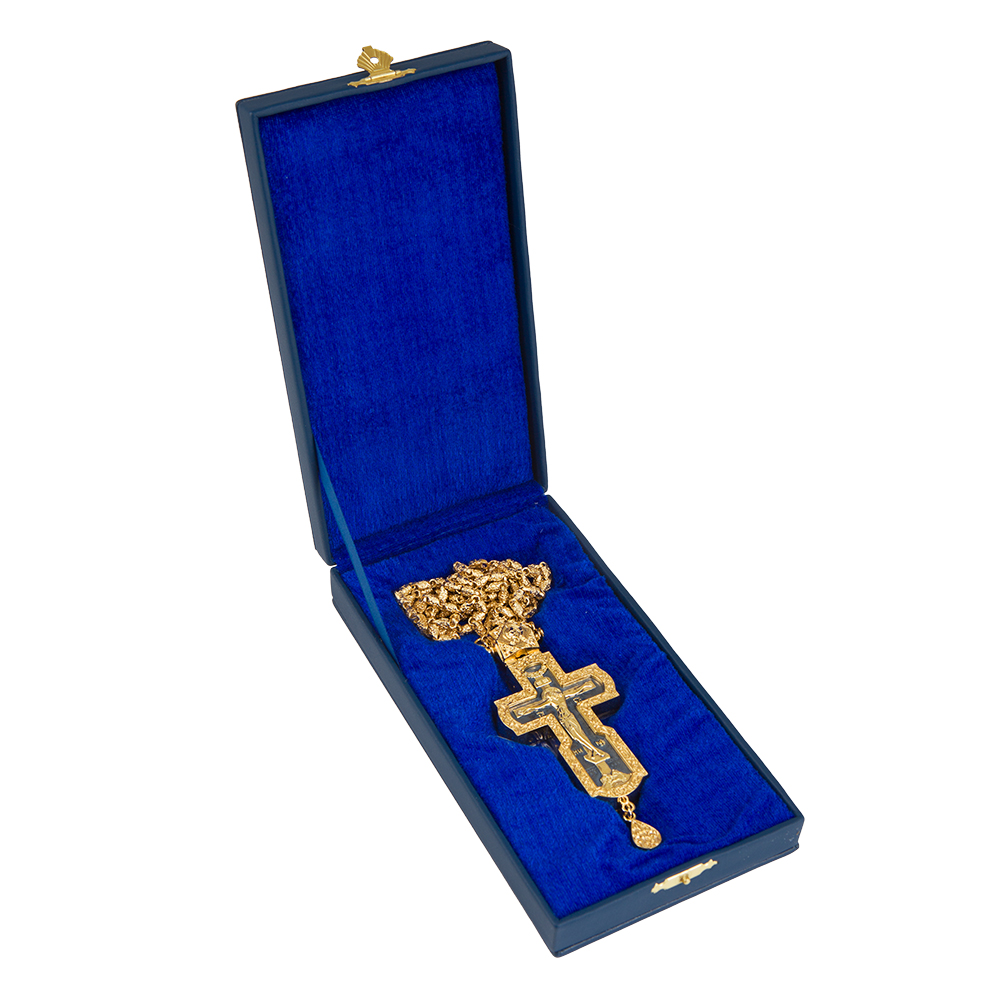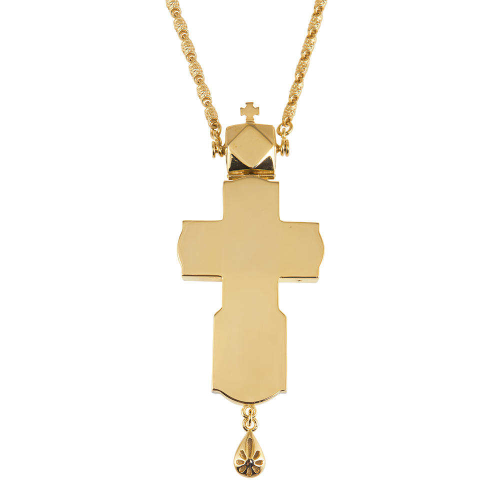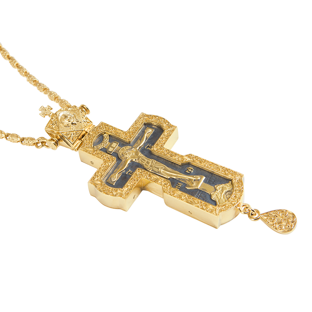 Крест наперсный из ювелирного сплава в позолоте и с чернением выглядит торжественно и строго.