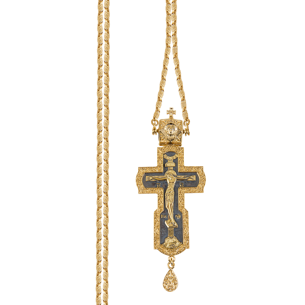 Крест наперсный с цепью имеет традиционную форму, декорирован качественной позолотой и чернением. Оглавие и подвеска по стилистике перекликаются с наградами дореволюционной Церкви. Изделие выполнено из ювелирного сплава при помощи литьевого оборудования и умелой обработки металла мастерами-ювелирами. На рельефные элементы креста нанесена позолота методом гальванообработки, который обеспечивает износостойкость, препятствует коррозии и окислению поверхностей. Благодаря сочетанию чернения и позолоты крест выглядит изысканно и торжественно. Наперсный крест с цепью реализуется в эстетичной фирменной упаковке.
